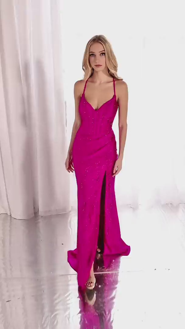 فستان كووليت CL6131 من الساتان المرن، بتفاصيل حجرية، ربيع 2026 لحفلات التخرج.