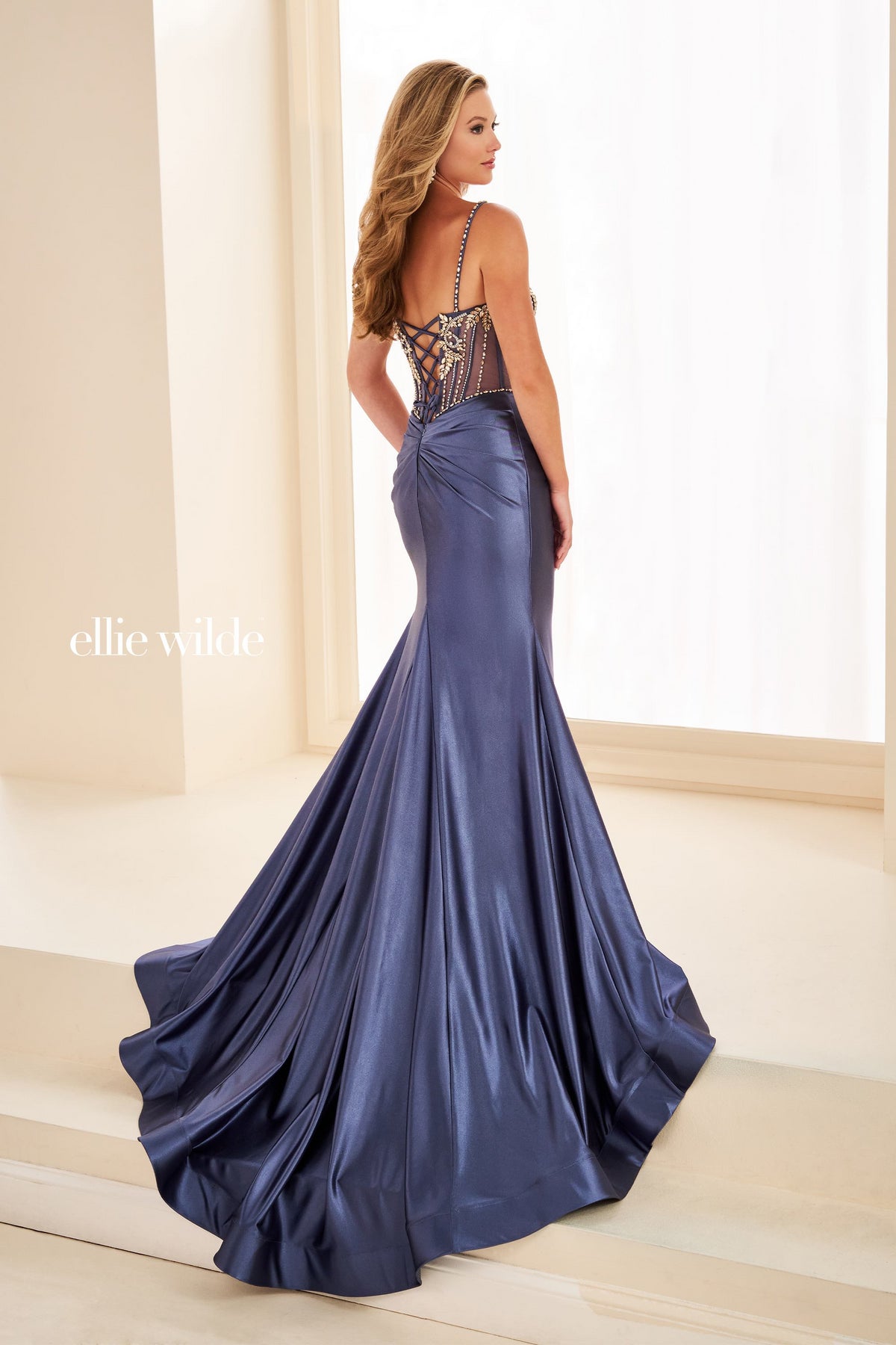 إيلي وايلد EW37017 قماش مطاطي، تول لامع، لمسات حجرية فستان حفلات ربيع 2026.