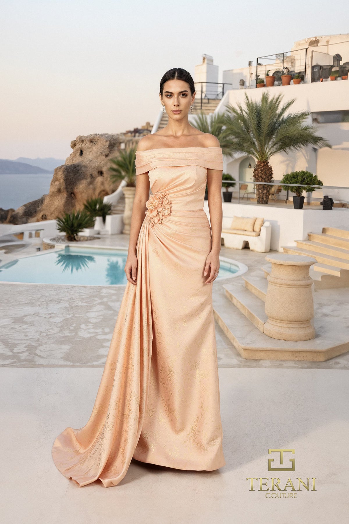 Command attention with the timeless elegance of the 261M6444 Off-the-Shoulder Jacquard Gown, a sophisticated choice for the modern mother of the bride. This fitted sheath silhouette is crafted from luxurious jacquard that shimmers with understated metallic accents, offering both refinement and allure. The off-the-shoulder neckline frames the décolletage beautifully, while delicate pleating and a softly draped bodice enhance the figure with grace. A side floral applique adds a couture-inspired detail, elevating the gown’s overall artistry. Designed with a full-length skirt and 46-inch hem from the waist, it elongates the silhouette for a statuesque finish. The center back zipper with hook-and-eye closure ensures a flawless fit throughout the evening. Available in elegant shades of Blush Gold, Midnight Gold, Sage Gold, and Blue Stone Gold, this gown embodies both classic glamour and modern sophistication.