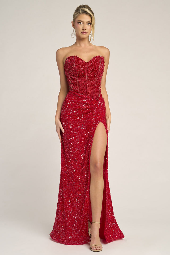 Step into the spotlight with the Portia & Scarlett PS26432C, a stunning addition to your evening wardrobe. Crafted from exquisite beaded material that captures the light with every movement, this fitted gown exudes elegance and sophistication. The alluring sweetheart neckline and strapless design enhance your silhouette, while the daring slit adds a touch of boldness, perfect for making a statement at any couture event or prom. The meticulously constructed corset provides support while hugging your curves in all the right places, ensuring you feel as fabulous as you look. With a seamless zipper back for effortless wear and a long length that trails beautifully behind you, this dress is designed for those who crave luxury and refinement. Embrace the enchanting spirit of the Portia & Scarlett PS26432C and transform your evening into an unforgettable affair.