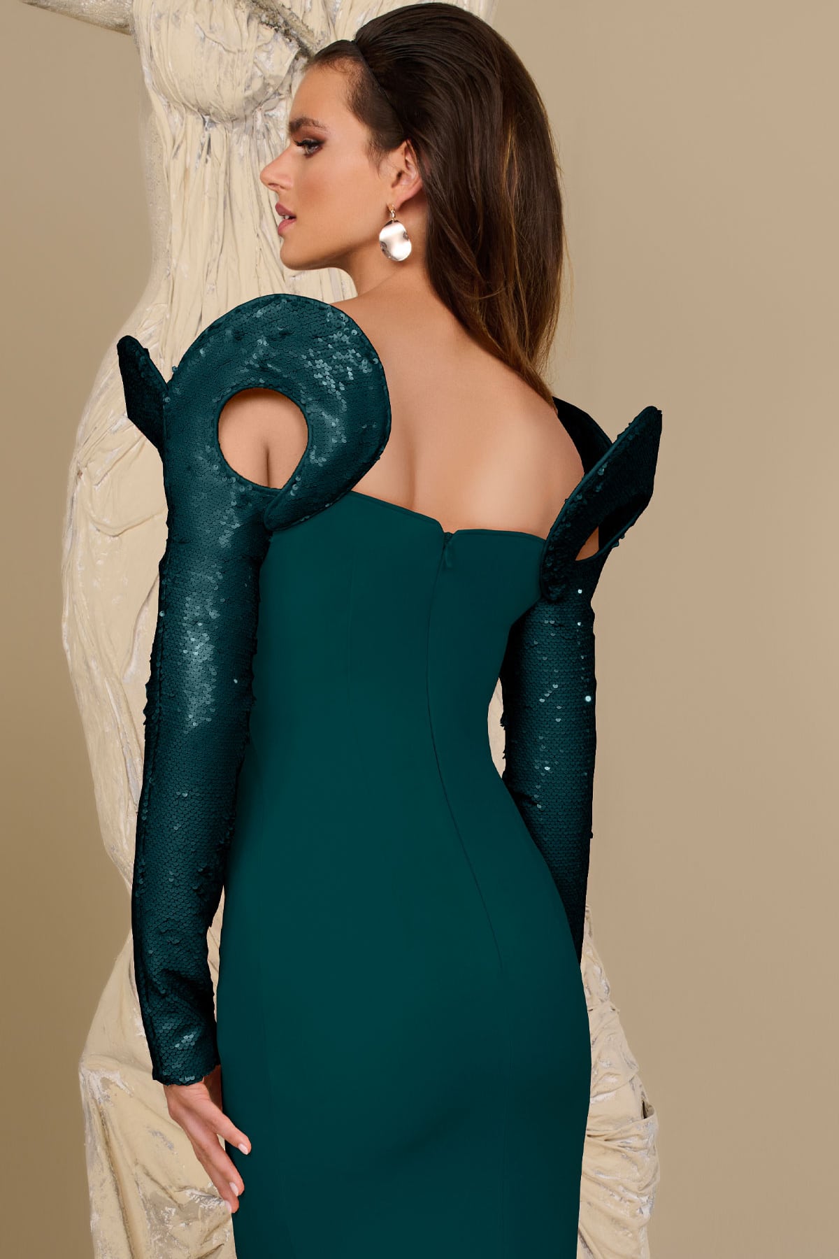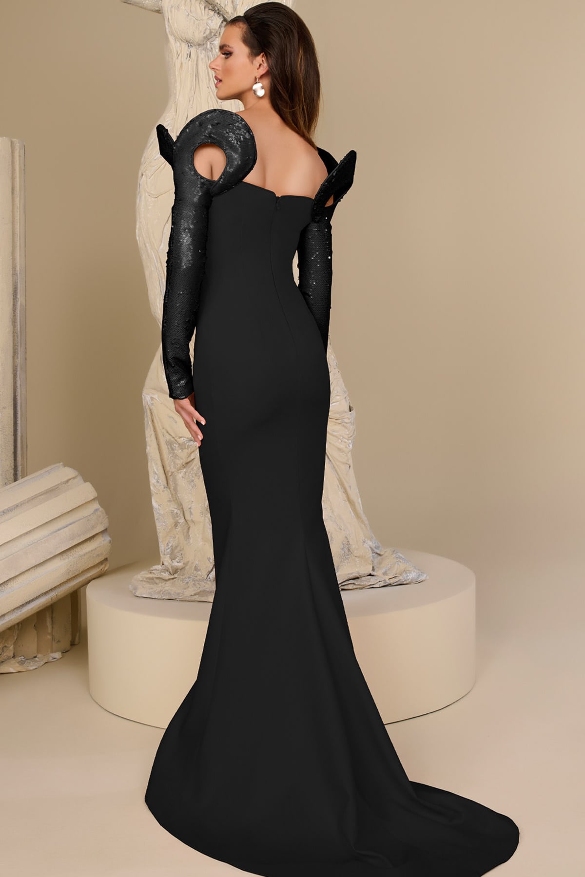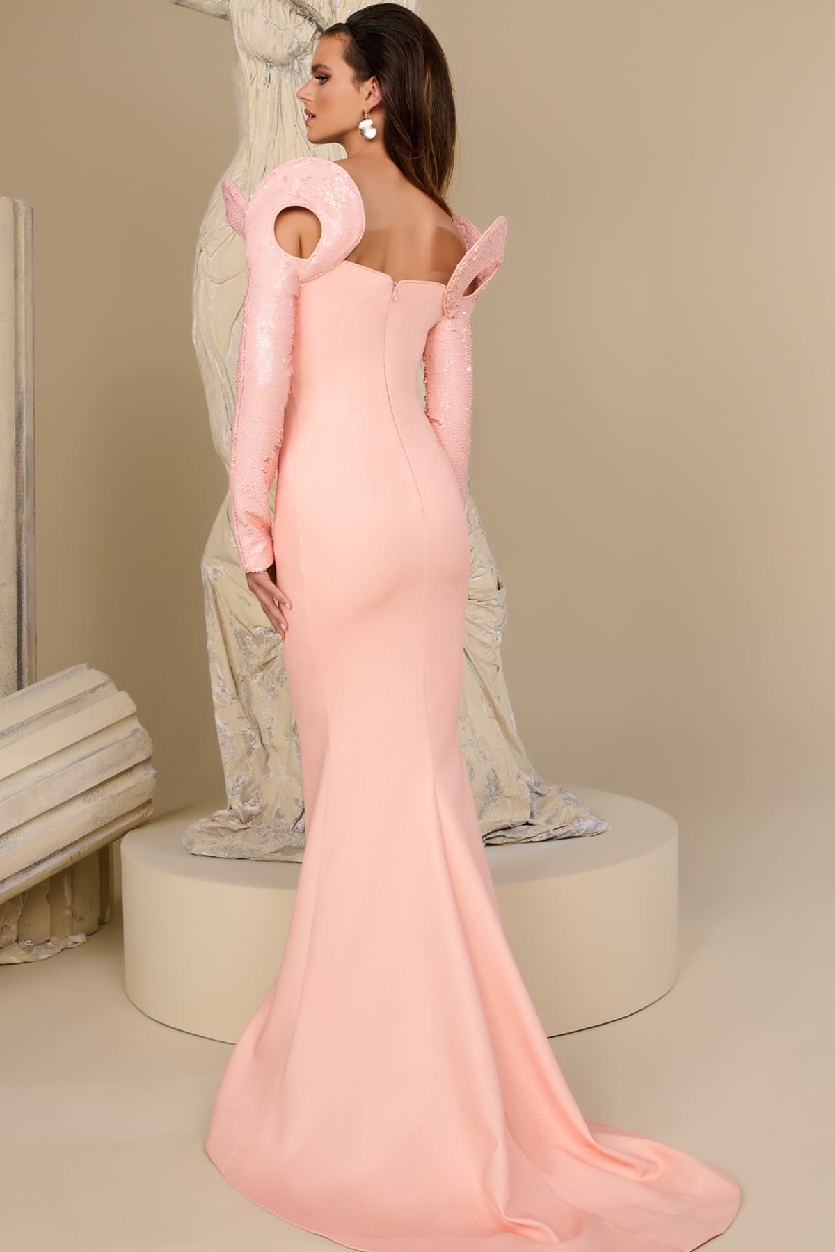 ادخلي عالم الأناقة الفريدة مع فستان MNM Couture F02942. مصنوع من الساتان الفاخر، يتميز هذا التحفة الفنية بطول الأرضية برقبة عميقة جريئة وظهر مفتوح جذاب يعكس الثقة والرقي. الأكمام الطويلة المزينة بالترتر اللامع والتصاميم الدقيقة تخلق صورة ظلية ساحرة تبرز الخصر بشكل جميل. الطيات الرائعة والتطريز الدقيق تضيفان لمسة من الفخامة، بينما ينسدل التصميم على شكل حورية البحر عند الحافة، مما يضمن دخولًا مهيبًا في أي مناسبة مسائية، حفلة تخرج، أو حفل رسمي. احتضني السحر واصنعي بيانًا يبقى في قلوب كل من يراه.