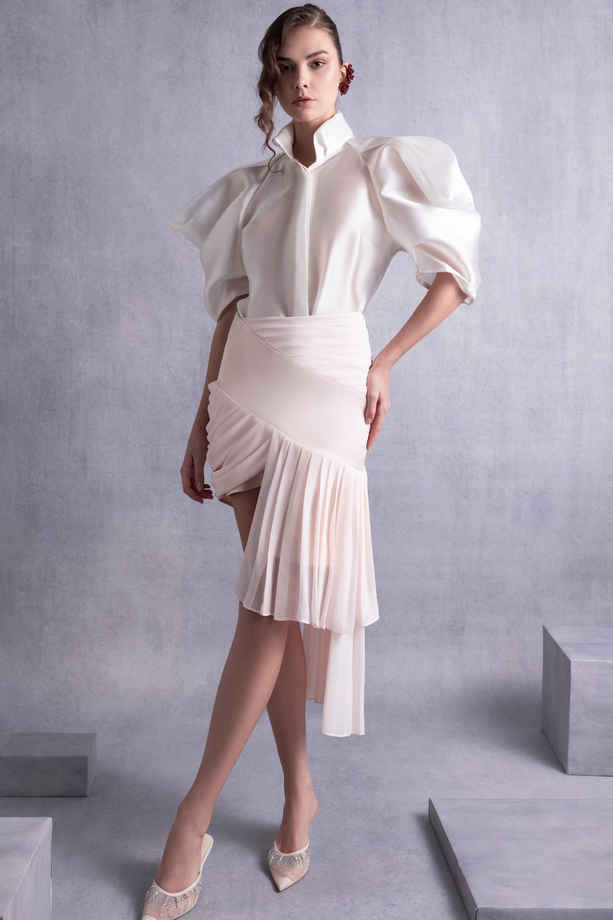 ارتقِ بخزانة ملابسك المسائية مع فستان MNM Couture GOS2522، مزيج رائع من الأناقة والفن. مصنوع من الشيفون والحرير الفاخرين، يتميز هذا القطعة الرائعة بأكمام منتفخة درامية تبرز الوجه بشكل جميل، بينما تضيف القصة العالية والمنخفضة لمسة عصرية. التصميم المعقد من التجاعيد والطيّات يشكل ملاءمة جذابة تبرز منحنياتك، مما يجعله مثالياً للحفلات الرسمية والسهرات الفاخرة. يكتمل هذا الزي المذهل بياقة أنيقة وسحّاب خلفي خفي، ليضمن لك التألق بالأناقة والثقة في كل مناسبة.