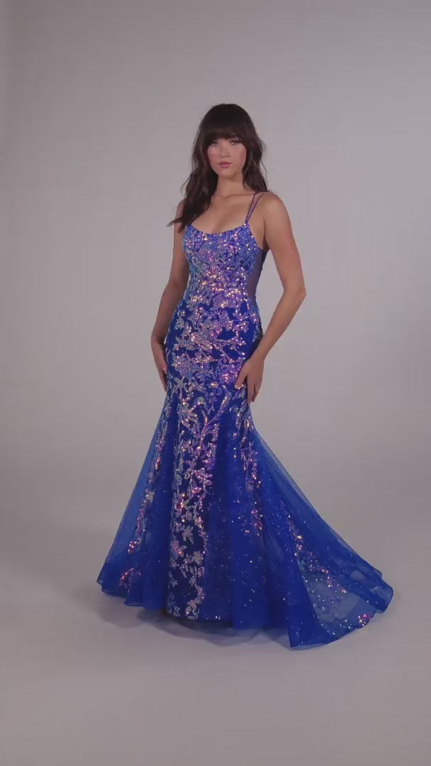 Step into an evening of effortless elegance with the Ellie Wilde EW35008, a meticulously crafted mermaid silhouette that contours your figure with refined grace. This long dress, adorned with shimmering sequin embellishments and ethereal tulle, captures light with every movement, creating a luminous glow that commands attention. The scoop neckline and delicate strap details frame your collarbone beautifully, while the corset lace-up back adds a bespoke touch of allure and impeccable fit. A subtle train extends behind you, accentuating your every step in timeless sophistication—perfect for those unforgettable nights where you desire to be truly unforgettable.