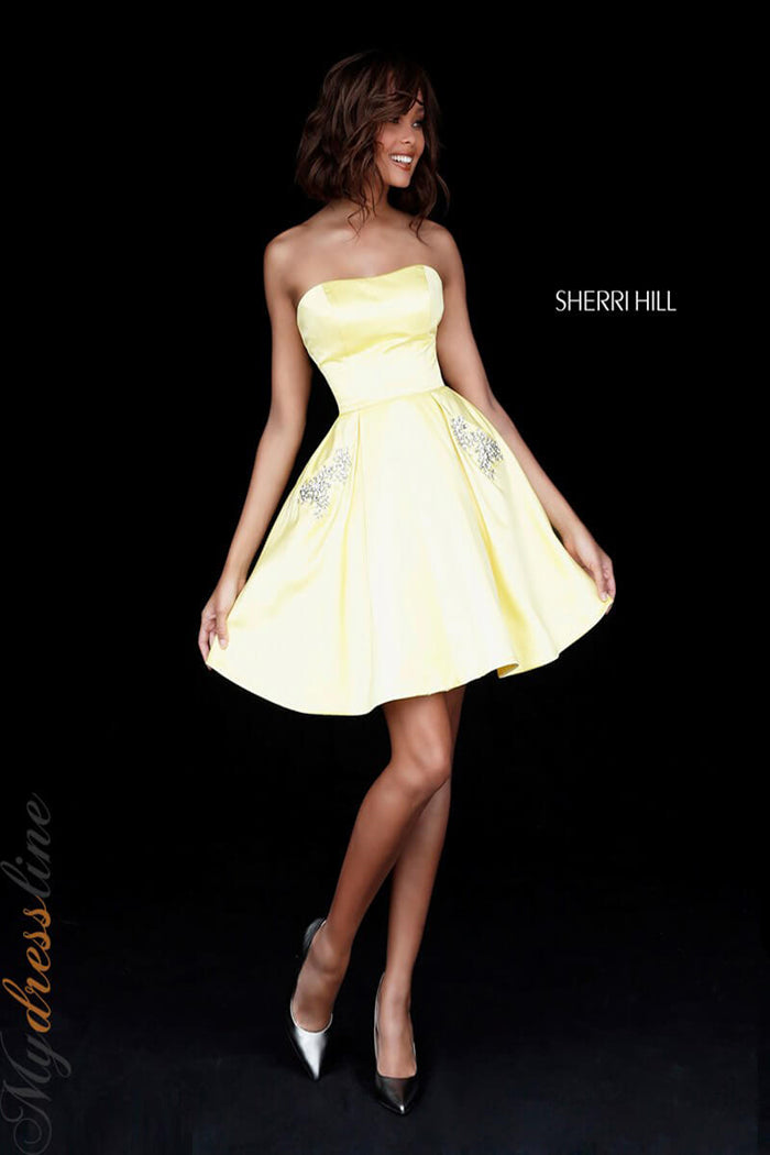 Step into the spotlight with the Sherri Hill 51390, a strapless A-line masterpiece designed to elevate your special occasions. Crafted from sumptuous satin, this short dress luxuriates in a sleek, smooth texture that glides effortlessly over your silhouette. The sweetheart neckline adds a romantic allure, perfectly framing your décolletage, while the delicate shimmer of stones on the bodice captures light with every movement, turning heads wherever you go. A discreet back zipper promises a seamless fit, ensuring you feel confident and radiant at every cocktail party or homecoming celebration. Experience the flawless blend of elegance and modern glamour uniquely embodied by Sherri Hill.