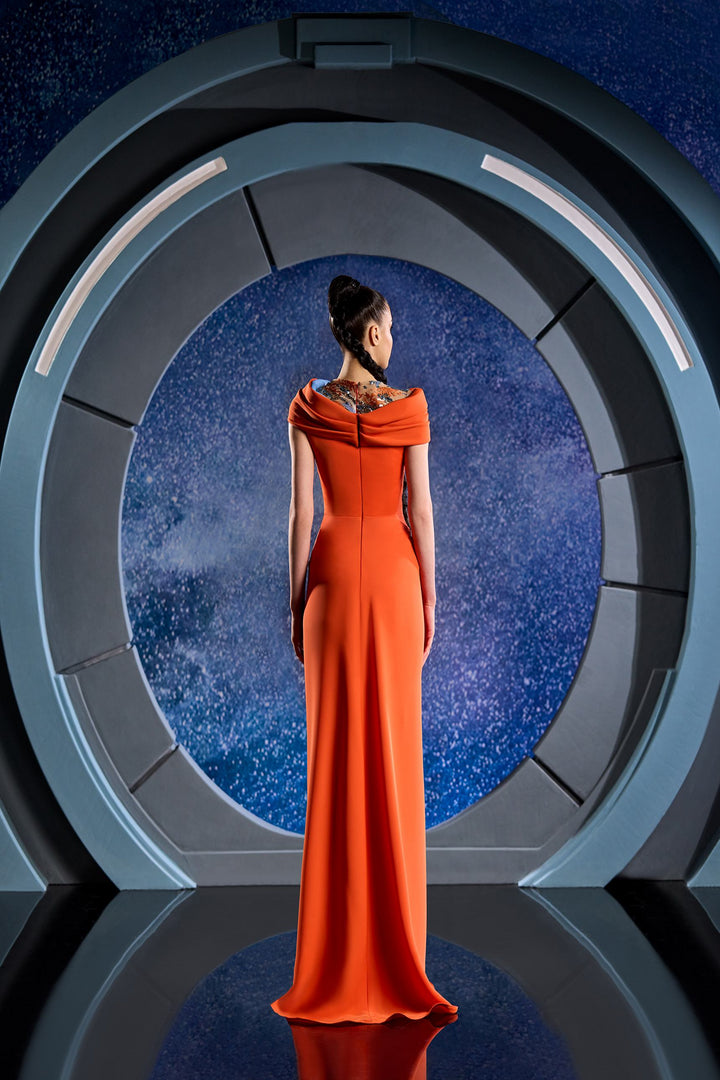 Experience refined elegance with the Reverie Couture FW131, a stunning crepe evening gown designed to captivate. This fitted masterpiece gently embraces your silhouette, highlighted by an off-the-shoulder neckline adorned with subtle gold embroidery that whispers sophistication. The draped bodice flows seamlessly into a cinched waist, enhancing your natural shape, while the high slit reveals a graceful stride, perfect for making an unforgettable entrance. Crafted with luxurious crepe, this long dress exudes timeless glamour, ideal for couture occasions or standing out as the mother of the bride. Glide effortlessly in a dress where every detail is curated to elevate your presence.