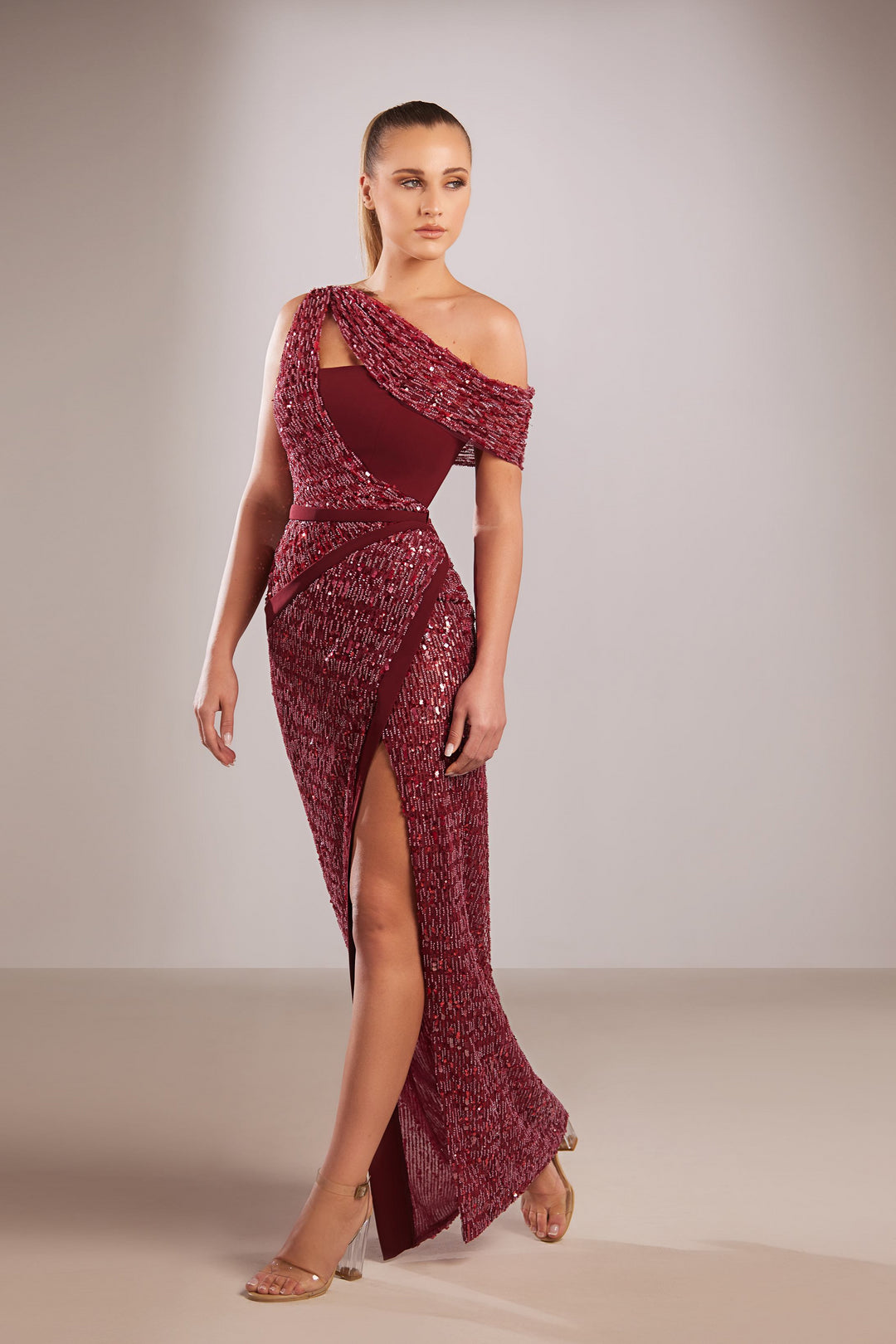 Step into a world of refined elegance with the Reverie Couture FW185 by Reverie Couture. This long, fitted evening dress drapes you in sumptuous burgundy crepe, embracing your silhouette with a sleek one-shoulder neckline and a daring off-the-shoulder sleeve that whispers sophistication. The integrated crepe bust offers seamless comfort while the high slit reveals just a hint of allure as you move gracefully through your event. Designed with an expertly concealed zipper at the back, this gown ensures a flawless fit, perfect for couture occasions or embodying timeless glamour as a mother of the bride. Experience the artistry of meticulous tailoring and feel radiant in this statement piece.