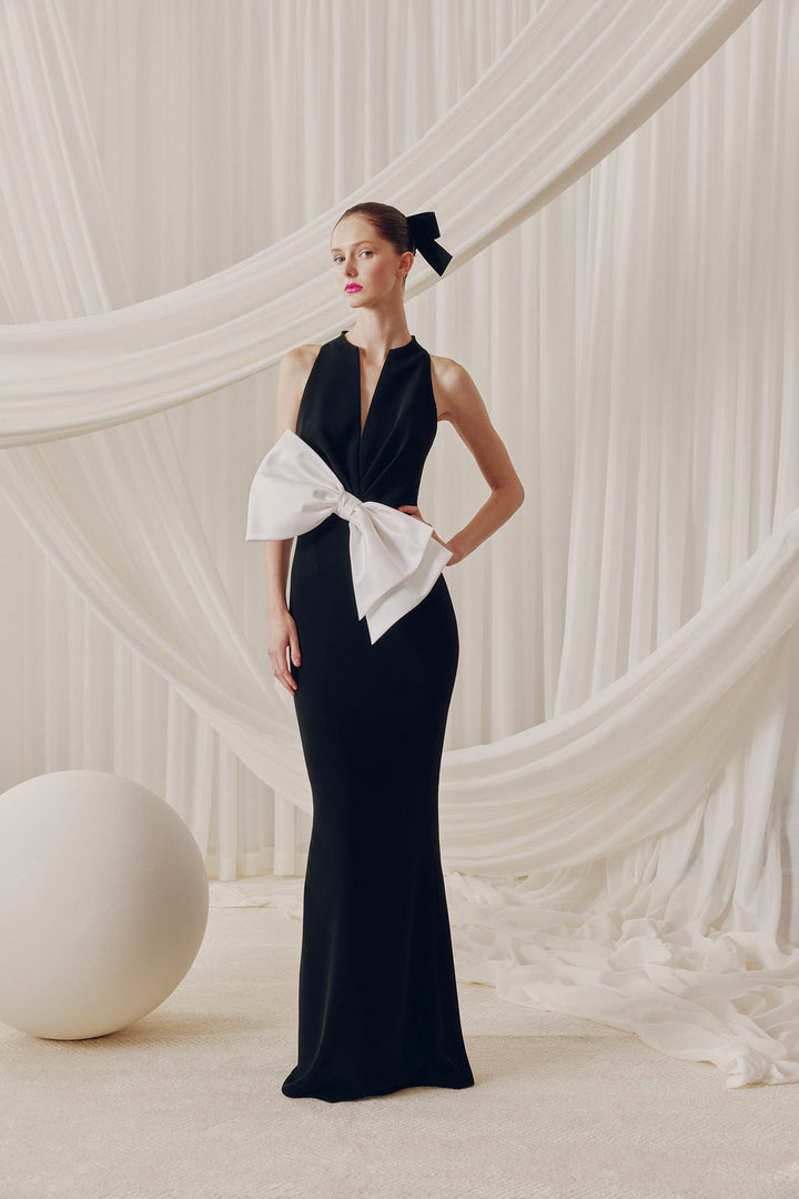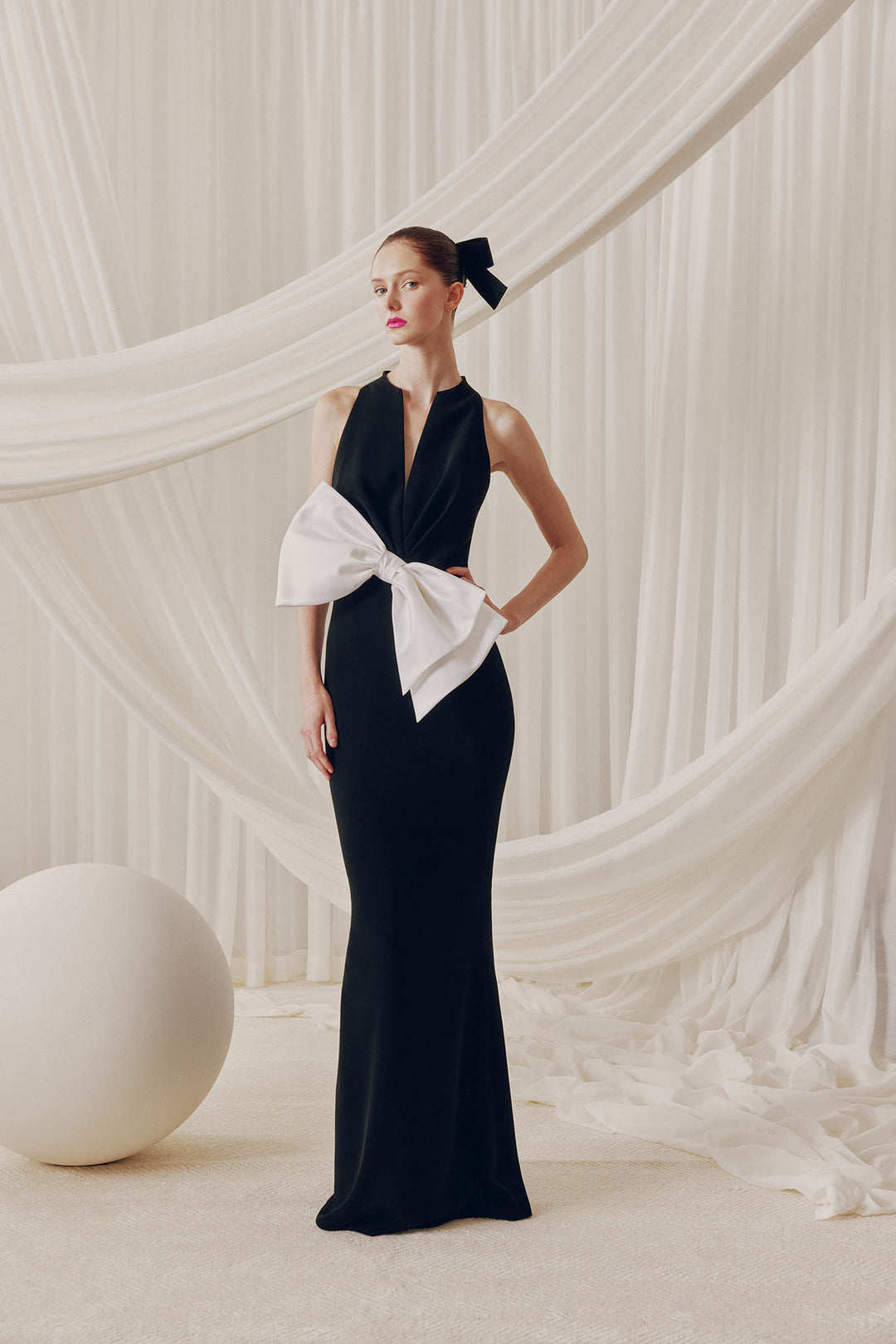 Elevate your evening with the Audrey+Brooks 6800, a masterful expression of refined elegance crafted for distinguished occasions. This sleeveless crepe gown sculpts your silhouette with its expertly fitted bodice and plunging V-neckline, drawing the eye to the graceful contrast bow that adds an artful flourish to the front. The fit and flare skirt flows seamlessly, creating a mesmerizing movement that embodies both sophistication and allure. Satin lining ensures a sumptuous feel against your skin, while a concealed back zipper preserves the gown's sleek profile. Designed to celebrate moments of grandeur, this long dress is your flawless companion for couture events and special celebrations alike.