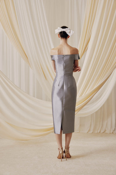 Experience refined elegance with the Audrey+Brooks 6824, a flawlessly tailored off-the-shoulder midi dress crafted from sumptuous Mikado fabric. The fitted bodice, accentuated by a draped collar detail, embraces your silhouette with a sophisticated allure, while the strapless neckline elevates your décolletage with timeless grace. The sheath skirt, expertly designed with a daring back slit and discreet zipper closure, allows effortless movement and an understated touch of sensuality. Fully satin lined, this couture cocktail dress envelops you in comfort and luxury, making every moment unforgettable when you seek a statement of impeccable style.