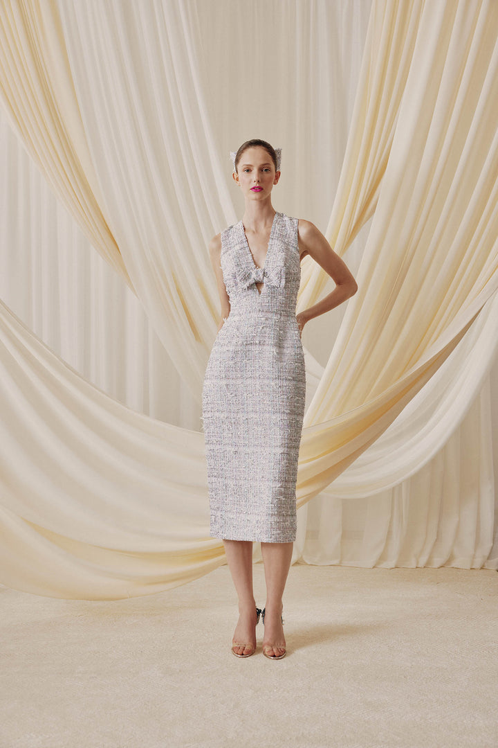 Step into refined elegance with the Audrey+Brooks 6826, a long tweed column dress designed to captivate. Crafted with meticulous attention, its sleeveless bodice features a flattering V-neckline that gracefully frames your décolletage, while the wide waistband adorned with a delicate bow enhances your silhouette with subtle sophistication. The fitted sheath skirt flows seamlessly, punctuated by a back slit that offers both ease and allure. This couture piece, complete with a sleek exposed zipper and luxurious satin lining, elevates your presence at any cocktail event, enveloping you in timeless style and impeccable comfort.
