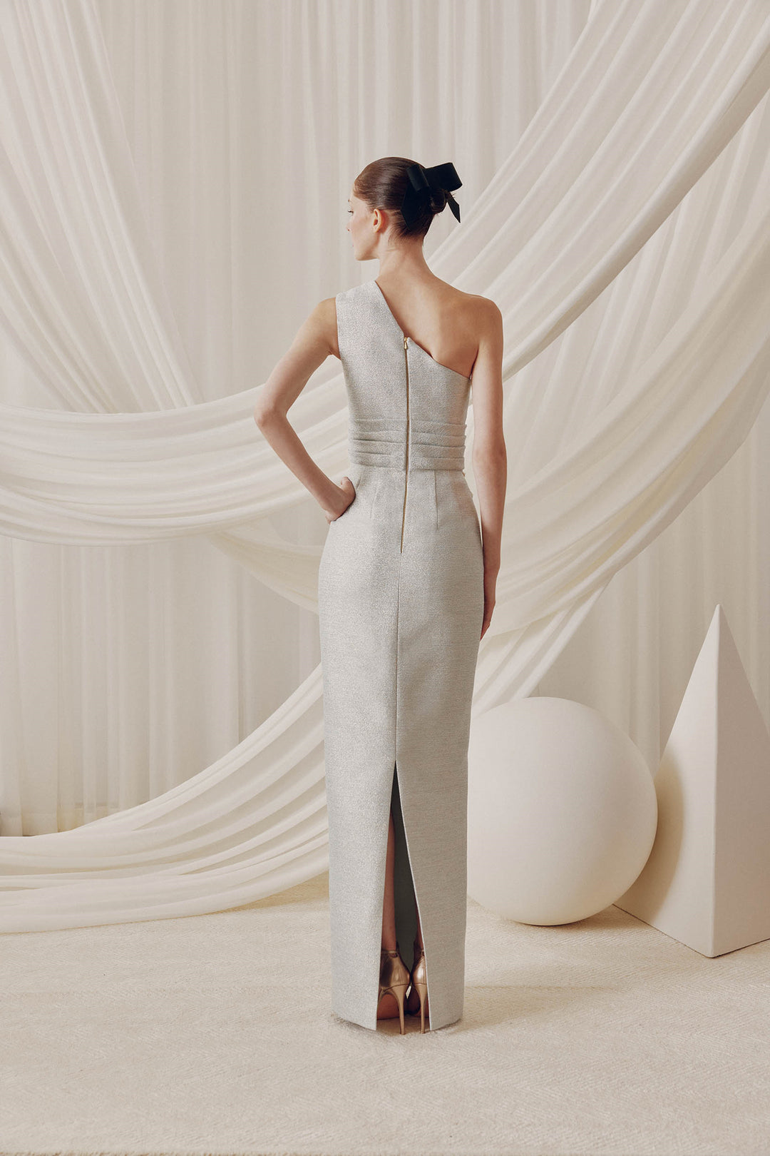 Elevate your evening with the Audrey+Brooks 6842, a silk-crafted masterpiece designed to radiate effortless sophistication. This long, fitted column gown features a graceful one-shoulder silhouette that seamlessly drapes into a flattering bodice and waistband, accented by a delicate fringed bowknot that catches the light with every movement. The sleek column skirt, enhanced by a tasteful back slit, promises both elegance and fluidity, while the exposed back zipper adds a modern, refined edge. Fully satin-lined for luxurious comfort, this gown embodies couture finesse, making you feel captivating and poised at every special occasion.