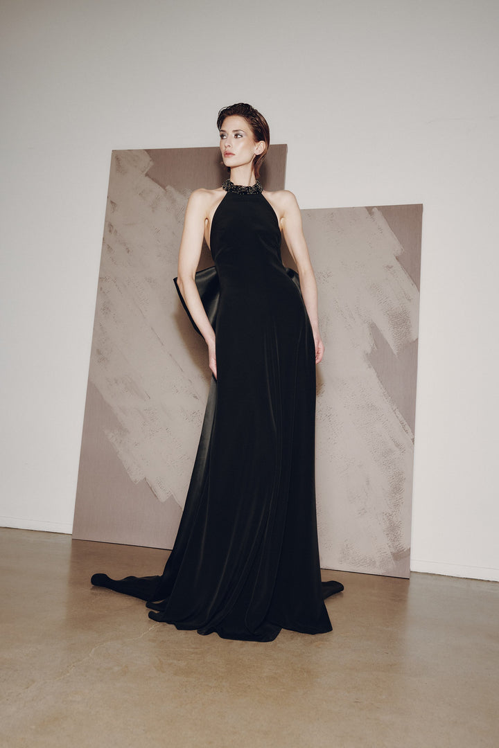 Elevate your evening wardrobe with the stunning Audrey+Brooks 6901 Halter Gown, a masterpiece crafted for grand occasions. This exquisite garment features a fitted silhouette in sumptuous crepe, gracefully hugging your curves and offering effortless elegance. The striking beaded collar and contrasting satin organza bow add an opulent touch, while the flowing train creates a dramatic effect as you walk, leaving an unforgettable impression. Ideal for mothers of the bride or couture events, this gown transforms traditional glamour into modern sophistication. With a hidden back zipper for a seamless finish, you’ll experience comfort that complements your radiant style. Step into the spotlight with confidence and allure, embodying the essence of luxury.