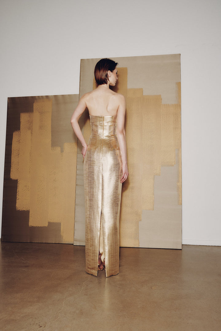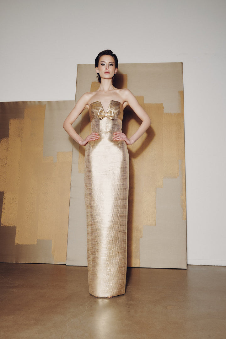 Introduce a touch of elegance to your evening wardrobe with the Audrey+Brooks 6940 gown, a true masterpiece crafted from sumptuous jacquard fabric. This fitted, strapless design features a striking V-neckline and an exquisite empire bodice that beautifully defines your silhouette. The dramatic center front slit adds allure, while the playful bow detail injects a touch of whimsy into the sophisticated ensemble. The long column skirt gracefully cascades down, punctuated by a back slit that enhances your every movement. Adorned with a discreet back zipper, this gown effortlessly marries convenience with luxury, making it the perfect choice for couture occasions or as a stunning Mother of the Bride attire. Slip into the Audrey+Brooks 6940 and experience the artistry of refined glamour.