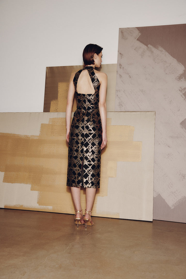 Introducing the stunning Audrey+Brooks 6943, a captivating halter dress that effortlessly combines confidence and elegance. Crafted from luxurious jacquard, this couture piece boasts a fitted silhouette that gracefully hugs your curves, enhancing your natural beauty. The knee-length design is both chic and sophisticated, accented by a daring slit that adds a touch of allure to your movements. The sleek sleeveless style, complete with a refined collar band, ensures you make a statement at any evening affair. Secured by a discreet back zipper, this exquisite dress is tailored for comfort and ease. Slip into this masterpiece and channel the season's most timeless glamour.