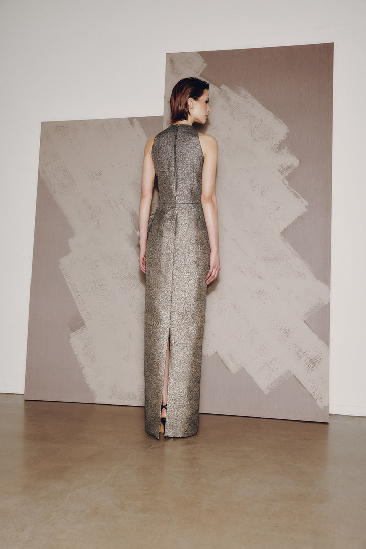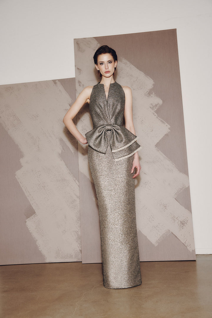 Elevate your evening look with the exquisite Audrey+Brooks 6947 gown, a stunning embodiment of luxury and sophistication. Crafted from sumptuous jacquard, this fitted column dress features a deep V-neckline that beautifully frames your décolletage, while an elegant collar and bow at the waist add a touch of refined charm. The long, flowing silhouette is accentuated by a daring back slit, allowing you to move with grace and confidence. Perfect for couture events, this sleeveless masterpiece boasts a chic exposed zipper that not only ensures a flawless fit but also enhances its modern allure. Each detail of this dress has been thoughtfully curated to flatter your figure and make a striking impression, whether you're celebrating as the mother of the bride or attending an exclusive soirée. Indulge in luxury and make unforgettable memories in the Audrey+Brooks 6947.