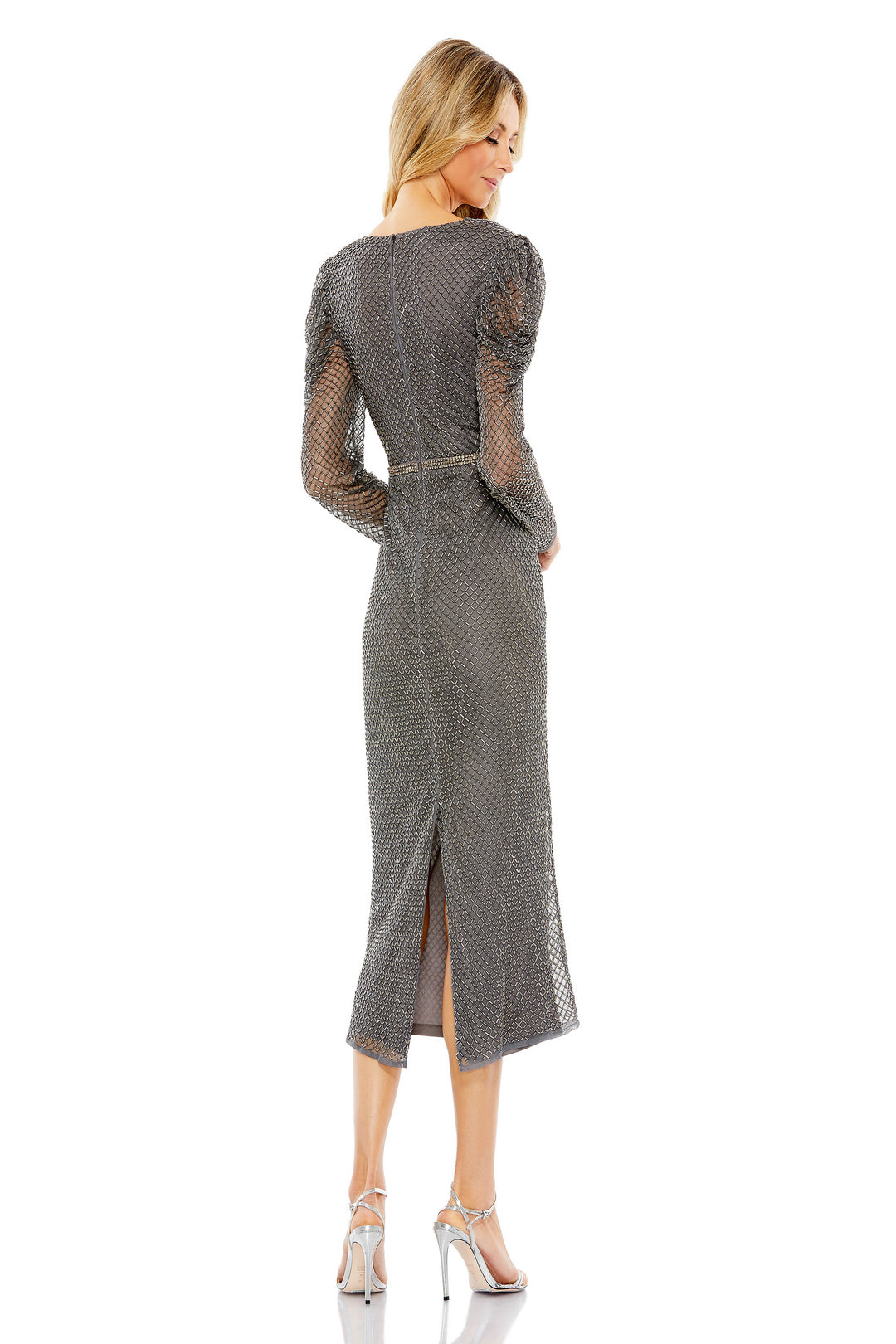 Step into sophisticated glamour with the Mac Duggal 93674, a beaded column dress that elevates your cocktail ensemble to unforgettable heights. This luxurious midi dress contours your silhouette with a flattering V-neckline and long sleeves, while the delicate beading captures the light with every movement, creating a shimmering texture that commands attention. A daring side slit adds a modern twist, perfectly balanced by the polished zipper back for a seamless fit. Designed for those who embrace elegance and confidence, this exquisite piece invites you to make an unforgettable statement at every refined evening affair.