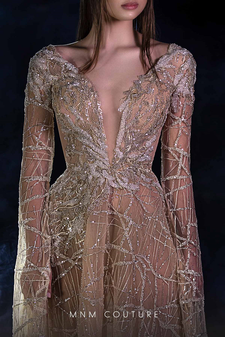 Experience unmatched elegance with the MNM Couture K3959, a long A-line evening gown designed for those who command attention. Crafted from exquisite beaded fabric adorned with delicate embroidery, this dress glides effortlessly over your silhouette, while the plunging neckline adds a daring touch of allure. The dramatic long cape sleeves cascade gracefully, evoking a sense of regal sophistication. Finished with a sleek zip-up back, this couture masterpiece transforms special moments into unforgettable memories. Whether attending a gala or honoring a bridal celebration, you'll radiate confidence and refined glamour in this breathtaking ensemble.