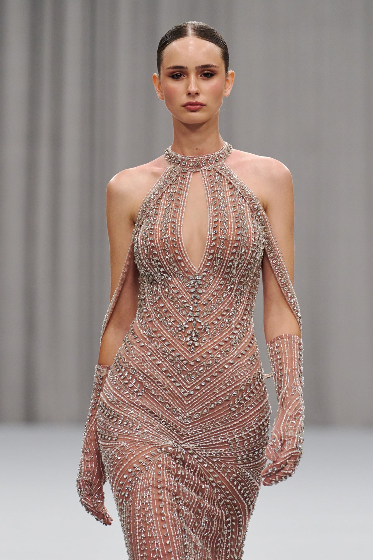 Step into the spotlight with the Chic and Holland HF110456, an exquisite evening gown designed to captivate. Crafted from lustrous beaded fabric, this fitted halter dress contours your form, radiating elegance with every movement. The sleek open back adds a daring touch, effortlessly blending sophistication with allure. Its long silhouette sweeps gracefully, enveloping you in refined glamour ideal for couture occasions. Feel the delicate shimmer of beads under soft lights, perfectly complementing your poise and confidence. Experience the artistry behind this masterpiece—a celebration of meticulous craftsmanship that elevates your evening into a breathtaking statement of luxury.