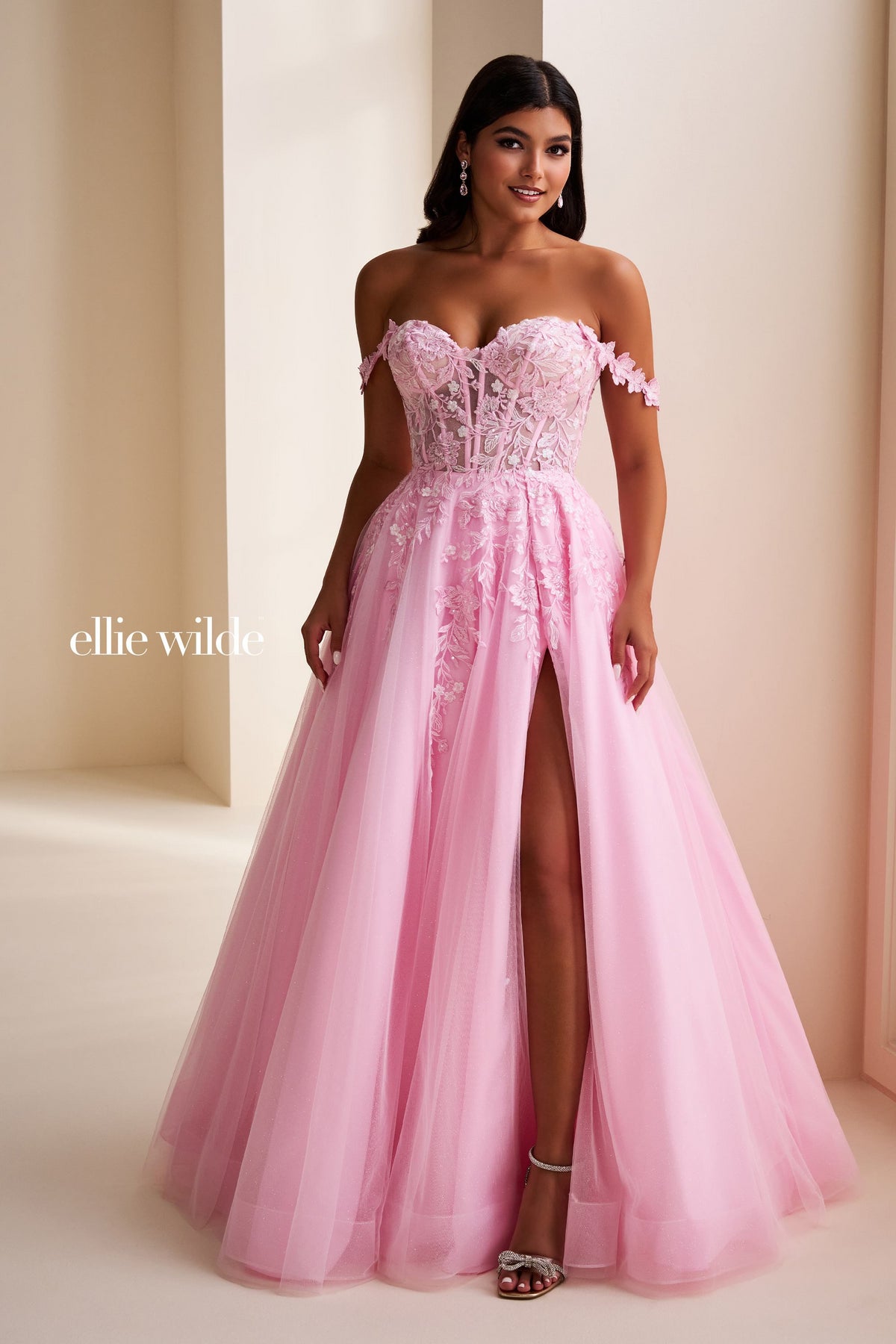 Step into the spotlight with the Ellie Wilde EW35101, a breathtaking evening gown that embodies refined luxury. Crafted from ethereal tulle adorned with intricate embroidery, this A-line silhouette gently flows with your every movement, while the delicate off-the-shoulder sleeves and sweetheart neckline frame your décolletage with grace. The shimmering sequin details and three-dimensional floral lace add a captivating texture, enhancing the gown’s romantic allure. A daring front slit offers just the right amount of sophistication and edge, ensuring you command attention at every special occasion. Designed with a discreet back zipper for a flawless fit, this long dress transforms your presence into an unforgettable moment of elegance.