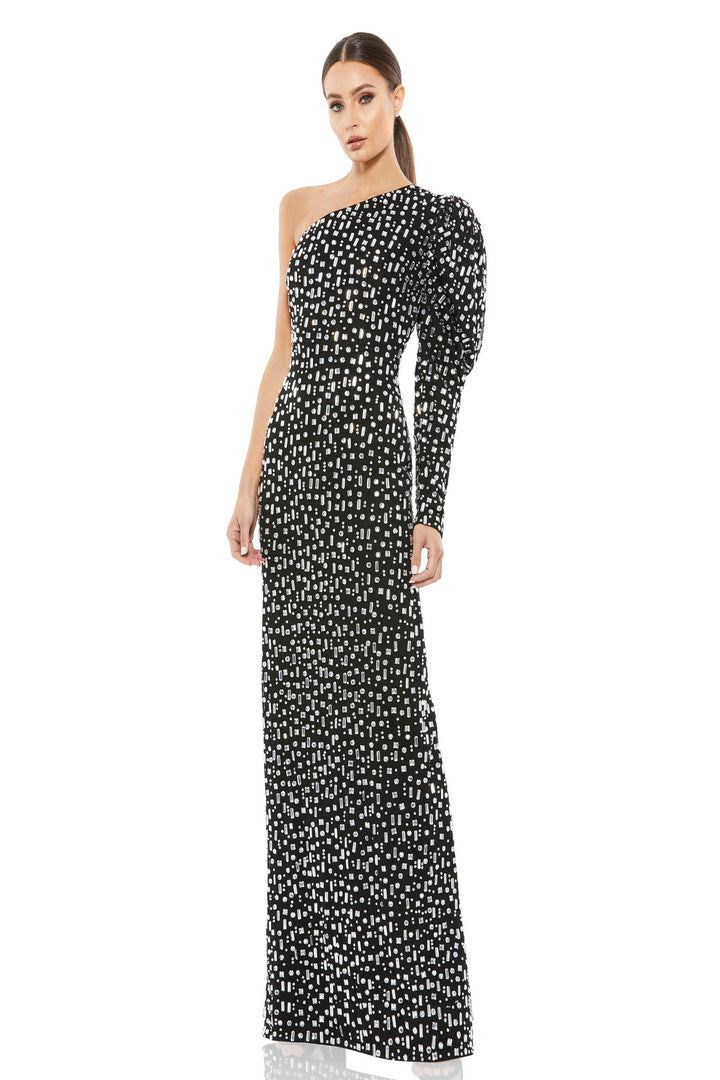 Step into the spotlight with the Mac Duggal 10768 evening dress, a flawless embodiment of elegance and allure. Crafted from intricately beaded fabric, the fitted column silhouette contours your figure, while the one-shoulder neckline offers a modern yet timeless charm. Long, luxurious puff sleeves add a romantic drama, perfectly balancing the daring slit that reveals just a hint of sophistication as you move. The discreet back zipper ensures a seamless, custom fit, allowing you to glide through your special evening with confidence. This exquisite gown elevates your presence, making every moment feel as captivating as the dress itself.