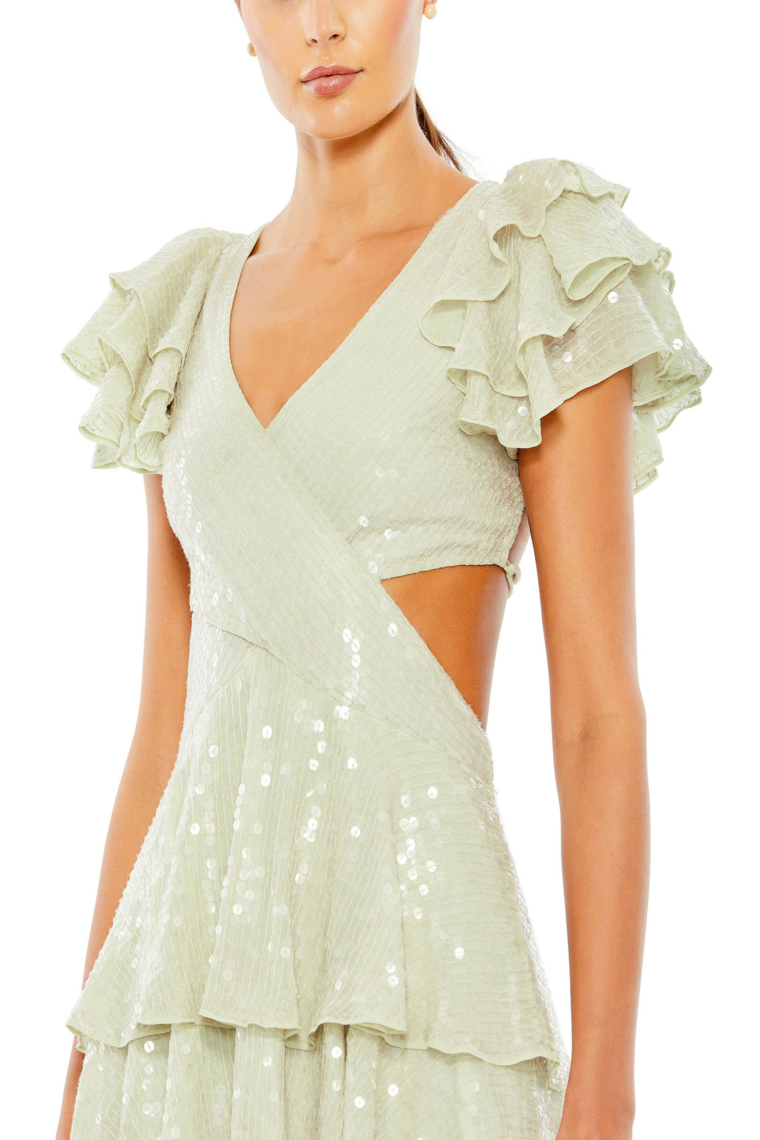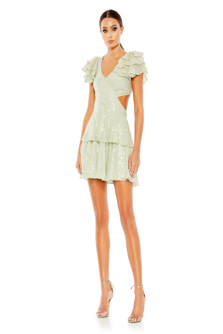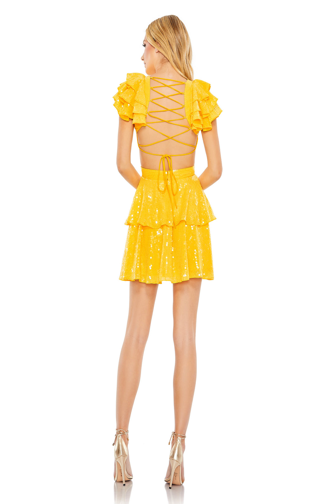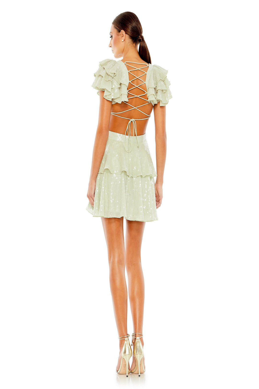 Step into the spotlight with the Mac Duggal 10831, a sequin mini dress designed to captivate and enchant. Crafted with shimmering sequins that catch the light at every turn, this A-line silhouette delicately balances playful charm and refined elegance. The plunging neckline frames your décolletage with irresistible allure, while the tiered skirt adds a dynamic sense of movement that promises to turn heads. Soft ruffle short sleeves enhance the romantic vibe, and the corset lace-up back offers a flattering, bespoke fit that contours your silhouette flawlessly. Perfectly suited for cocktail parties and homecomings, this dress transforms your evening into a celebration of glamour and confidence.