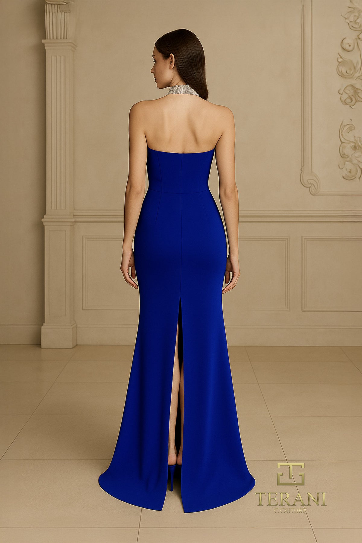 Step into modern sophistication with the Terani Couture 261E6119 evening gown, a striking design that radiates sleek elegance. Crafted from smooth scuba fabric, this strapless sheath silhouette delivers a flawless fit while maintaining clean, contemporary lines. The gown features a daring straight-across neckline and a dramatic crystal-embellished strip that cascades down the center, elongating the figure with eye-catching brilliance. A bold front slit adds movement and allure, while the 46-inch floor-length hemline ensures timeless evening glamour. Complete with a secure center-back zipper and hook-and-eye closure, this gown is both comfortable and captivating. Available in Royal, Red, and Ivory, it is the perfect choice for galas, formal receptions, or red-carpet events where making a statement is essential.