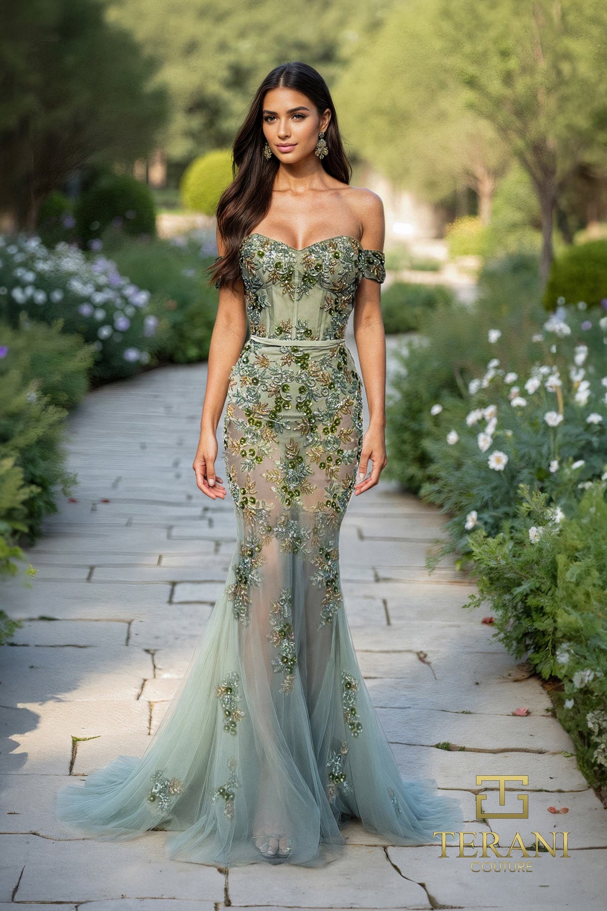 Terani Couture 261P6676 Off-the-Shoulder Mermaid Gown in Sage is a stunning blend of romance and modern sophistication. The sweetheart neckline with off-shoulder straps enhances the bodice, while dimensional embroidery and floral appliqués cascade across delicate tulle for a captivating effect. Designed with an illusion bodysuit lining, the gown delivers a fashion-forward statement while maintaining elegance. The mermaid silhouette sculpts the figure before flaring at the hem, with a 46" length from waist to hem creating a graceful finish. A center-back zipper with hook-and-eye closure ensures a secure fit. Also available in Royal, and offered in sizes 0–24, this gown is a glamorous choice for prom or evening occasions, ensuring unforgettable presence and confidence.
