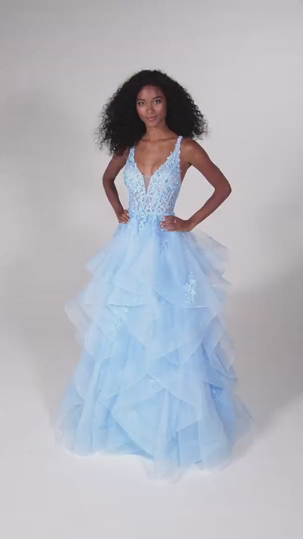 Step into the spotlight with the Ellie Wilde EW122080, a mesmerizing A-line ball gown designed to elevate your most cherished occasions. Crafted from delicate lace and ethereal organza, this long dress boasts a plunging neckline that exudes sophisticated allure, while tiered layers cascade gracefully, creating captivating movement with every step. The slender straps provide elegant support, and a discreet back zipper ensures a seamless fit, allowing you to move through prom night or a quinceanera celebration with effortless confidence. Experience the perfect harmony of luxury and comfort in this enchanting gown that transforms you into the epitome of refined glamour.