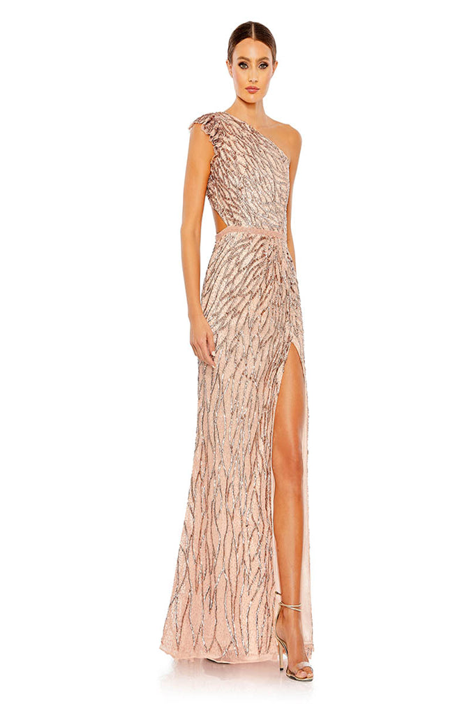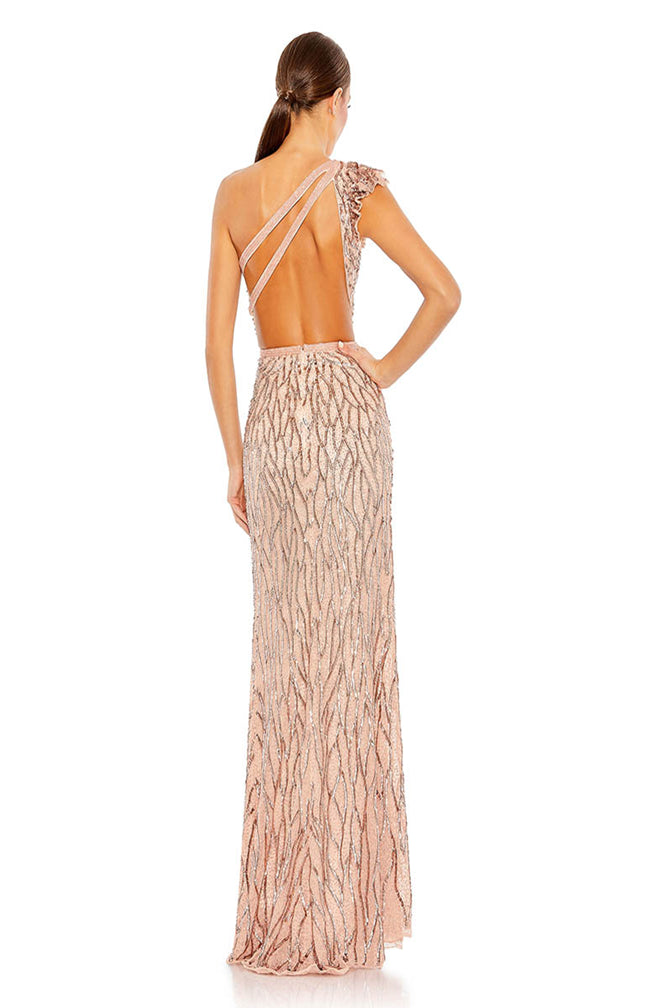 Elevate your evening wardrobe with the Mac Duggal 5680, a dazzling column gown designed to captivate. Crafted from shimmering sequin fabric, this long dress radiates sophistication with its sleek one-shoulder neckline and sophisticated sleeveless cut. Delicate ruffles cascade gracefully alongside a seductive slit, creating movement that enchants with every step. The open back offers a daring yet elegant statement, perfectly balancing allure and refinement. Whether attending a gala or an exclusive event, this exquisite gown ensures you command the room with timeless glamour and modern flair, embodying the essence of effortless luxury.