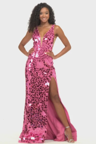 Step into the spotlight with the Sherri Hill 54149, a stunning evening gown designed to celebrate your confidence and elegance. Crafted from sumptuous scuba fabric, this column-fitted dress gracefully sculpts your silhouette, while a plunging neckline and delicate straps add a sophisticated allure. The dramatic mirrored detailing catches the light with every movement, perfectly complemented by a sweeping train and daring slit that reveal just the right amount of leg. Whether attending a gala or prom, this long dress promises a commanding presence, blending modern glamour with timeless romance for a look that will captivate and enchant all night long.