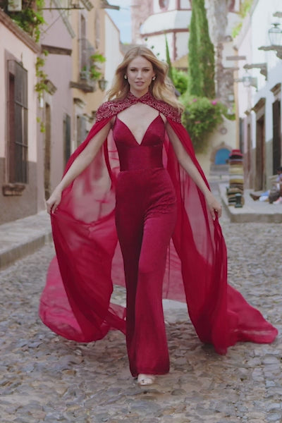 Elevate your evening with the Sherri Hill 55294, a stunning chiffon jumpsuit masterfully adorned with exquisite beading that catches the light at every turn. The graceful V-neckline harmonizes beautifully with dramatic cape sleeves, creating a silhouette that is both bold and refined. Crafted for the discerning wearer, its full-length pant design and discreet back zipper ensure seamless elegance and comfort. This piece embodies sophisticated glamour, perfect for making an unforgettable impression at any upscale event. Step into the allure of Sherri Hill and experience a seamless fusion of artistry and luxury designed to celebrate your most memorable nights.