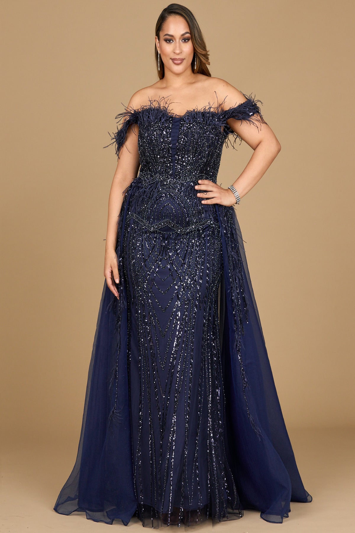 Step into unparalleled elegance with the Lara 29161 by Andrea and Leo, a breathtaking evening gown designed to captivate every gaze. This long, fitted dress showcases intricate beading that shimmers with each movement, while a graceful overskirt and delicate feather accents add a touch of ethereal sophistication. The strapless, off-the-shoulder neckline highlights your décolletage beautifully, creating an alluring silhouette for unforgettable moments. Crafted with a discreet zipper back for a flawless fit, this mother of the bride and plus-size gown celebrates your curves with luxurious detail. Embrace the night in a creation where artistry meets impeccable style.