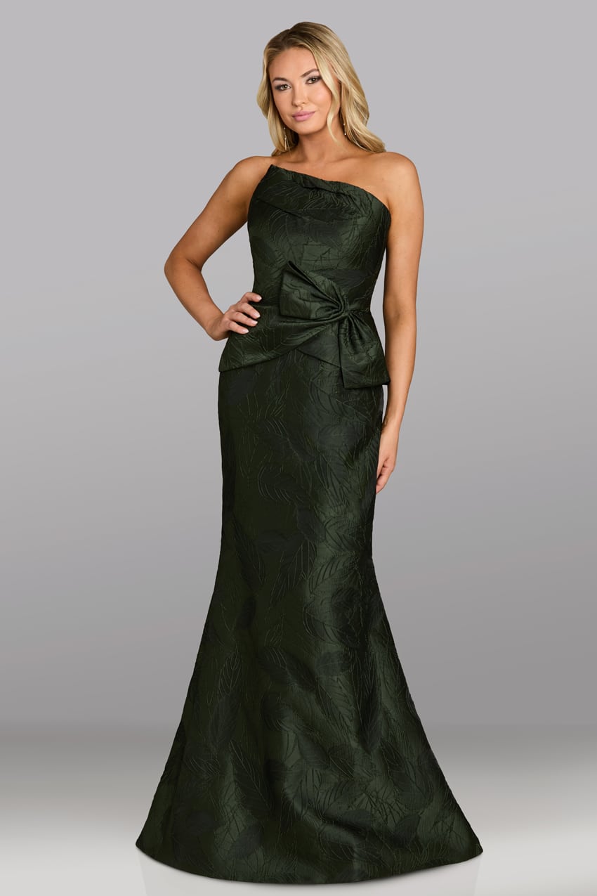 Indulge in the exquisite allure of the Gia Franco 12603 evening gown, a masterpiece crafted from luxurious satin and intricate jacquard. This floor-length silhouette features a captivating one-shoulder neckline, elegantly adorned with a delicate bow that accentuates the waist and enhances your figure. The mermaid cut gracefully hugs your curves, cascading into a dramatic flare that embodies sophistication and glamour. Perfect for formal occasions, from weddings to red carpet events, this gown ensures you are the center of attention, radiating confidence and elegance with every step.