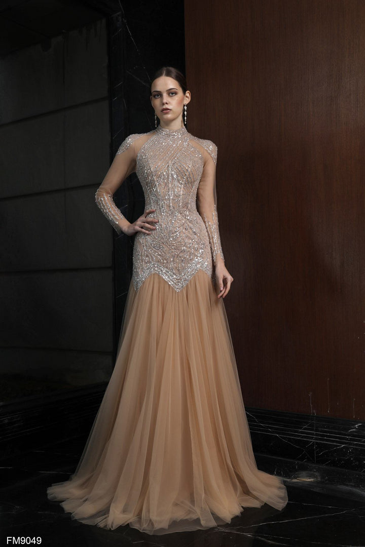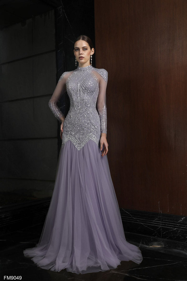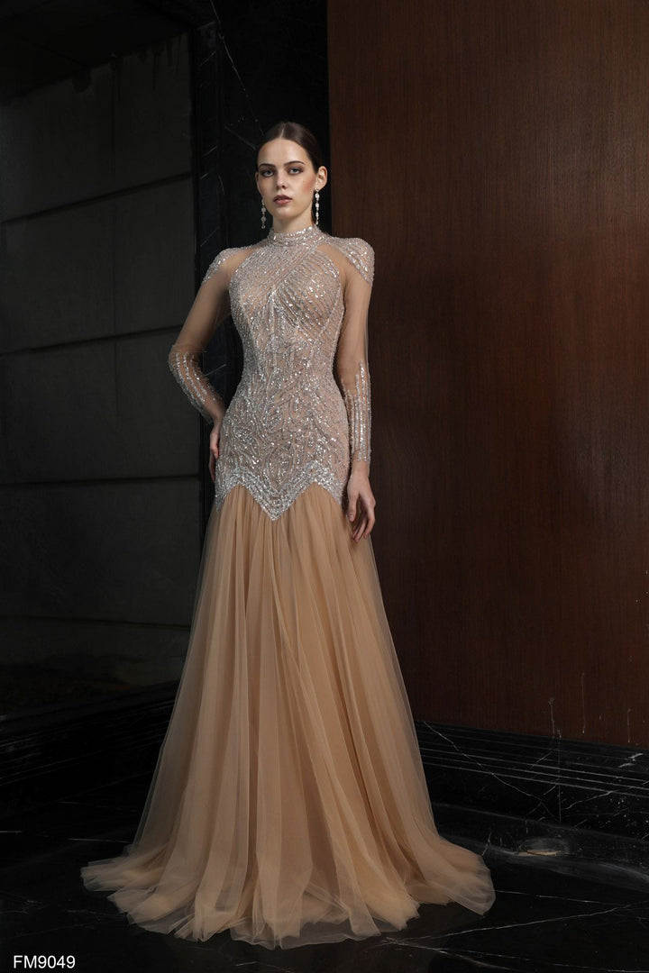 Step into timeless sophistication with the Azzure Couture FM9049, a long evening dress meticulously crafted to enhance your silhouette. The fitted tulle fabric softly embraces your form, while the elegant corset detail sculpts and defines your waist with exquisite precision. A graceful turtle neckline and long sleeves create an aura of refined poise, perfect for prestigious occasions or a mother of the bride ensemble. The discreet zipper at the back ensures a seamless fit, allowing you to move with confidence throughout the evening. This masterpiece from Azzure Couture’s Spring 2024 Collection transforms every moment into an unforgettable celebration of elegance and grace.