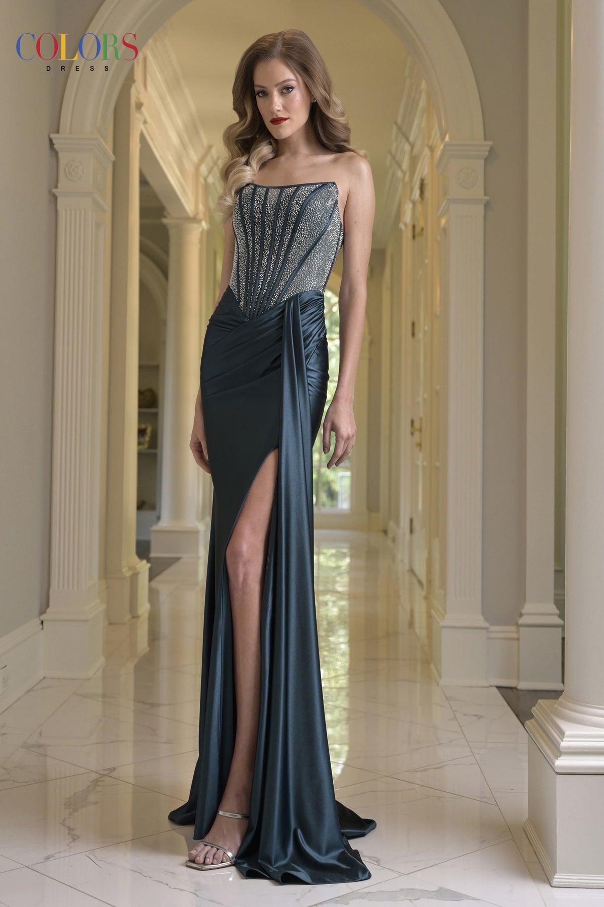 Elevate your evening with the Colors 3933 prom dress, a stunning creation designed to make you the center of attention. Crafted from luxurious satin, this fitted masterpiece drapes elegantly over your silhouette, accentuating your curves while offering an unparalleled comfort. The striking square neckline showcases your collarbone beautifully, while the strapless design adds an alluring touch, making it perfect for special occasions. The deftly tailored corset provides both structure and sophistication, complemented by a seamless zipper back for a refined finish. Whether you’re dancing the night away or posing for photographs, this long dress promises to exude confidence and grace. Make a statement that resonates with sophistication and style in the Colors 3933.
