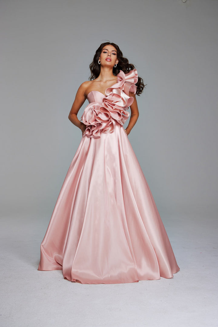 Elevate your evening elegance with the Jovani 40796, a masterful creation from the Fall 2024 collection designed to captivate at every glance. Crafted in sumptuous taffeta, this sleeveless ball gown boasts a striking one-shoulder neckline that drapes gracefully, while cascading ruffles add dynamic movement and a touch of drama to your silhouette. The long, flowing skirt creates a regal presence, perfect for those moments when you want to feel effortlessly radiant. With a discreet zipper back for a flawless fit, this dress promises comfort alongside its undeniable allure, making it an impeccable choice for sophisticated evenings or honoring special roles with refined glamour.