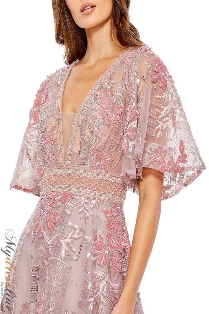 Step into an evening of elegance with the Mac Duggal 20262, an opulent creation designed to elevate your presence at any special occasion. This luxurious A-Line gown, crafted from delicate lace, features intricate beading that artfully enhances your silhouette. The plunging illusion neckline invites a captivating allure, while the graceful train flows softly behind you, creating a mesmerizing entrance. Choose between dramatic bell sleeves or a chic short-sleeve style, both adding a refined, contemporary edge. With its smooth back zipper ensuring a flawless fit, this long dress is a stunning choice for an evening affair or a distinguished mother of the bride look, embodying sophistication and timeless glamour.