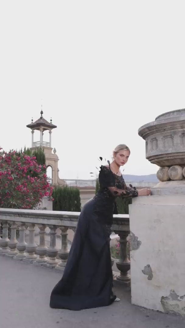 261M6410 A-Line Gown is an elegant mother-of-the-bride dress designed with an illusion neckline and dramatic off-the-shoulder full sleeves. The bodice features intricate beaded tulle details, complemented by a structured mikado skirt in a flowing A-line silhouette. Complete with a center-back zipper and hook-and-eye closure. Available in Black Nude, Wine Nude, and Emerald Nude.