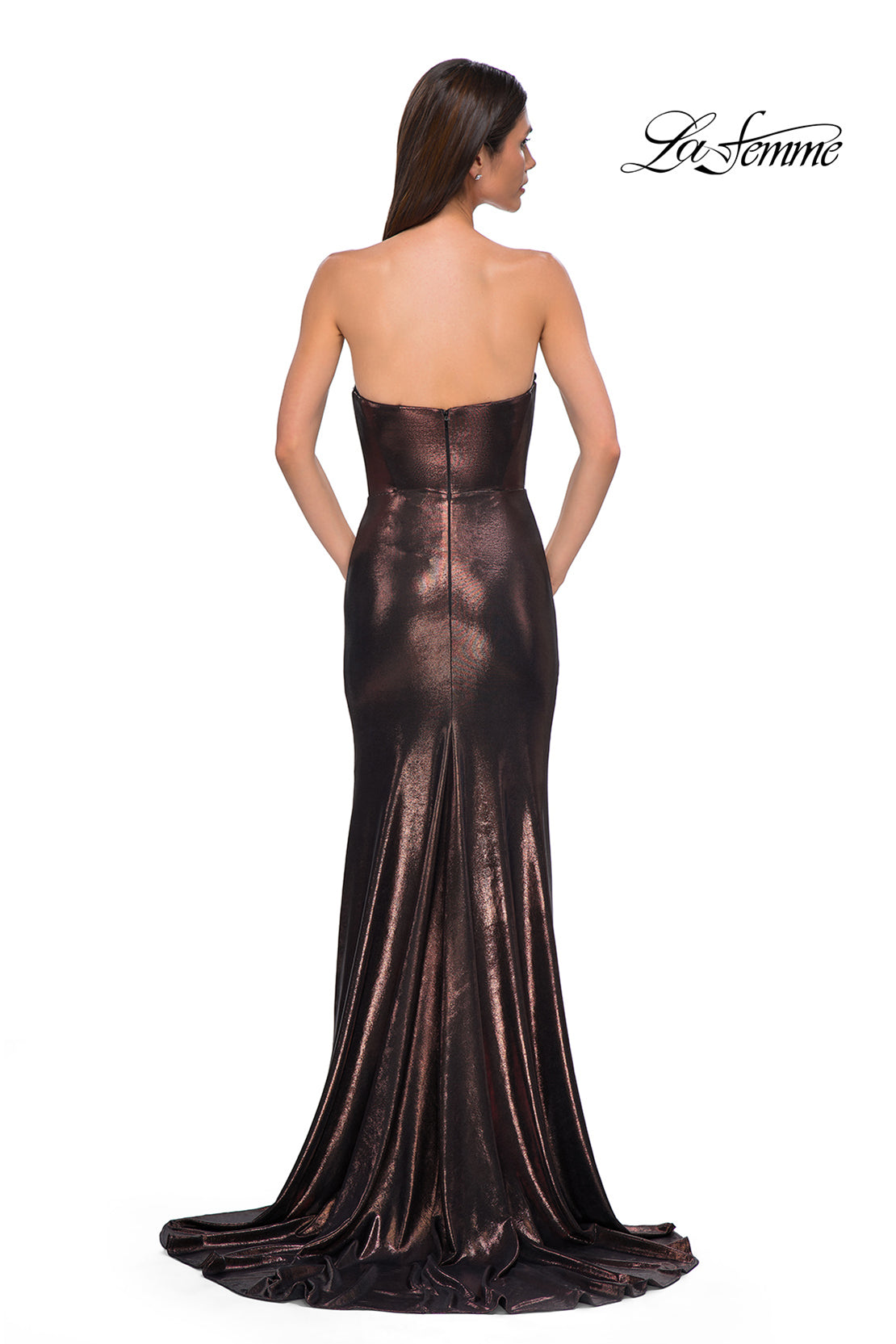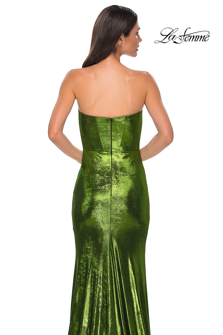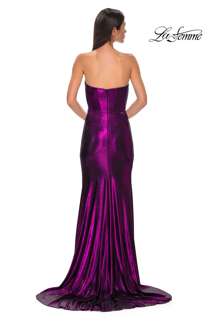 Elevate your evening ensemble with the La Femme 32828, a stunning creation from the Spring 2025 Evening Collection. This long, fitted metallic gown drapes over you like liquid light, its strapless sweetheart neckline beautifully framing your décolletage. The expertly crafted corset sculpts your silhouette, while the daring slit and elegant train add movement and drama every step you take. Designed with impeccable detail, its smooth zipper back ensures a flawless fit, exuding confidence and grace. Wearing La Femme 32828 transforms any special occasion into a celebration of refined glamour and modern sophistication. Indulge in the allure of this statement piece, destined to leave a lasting impression.