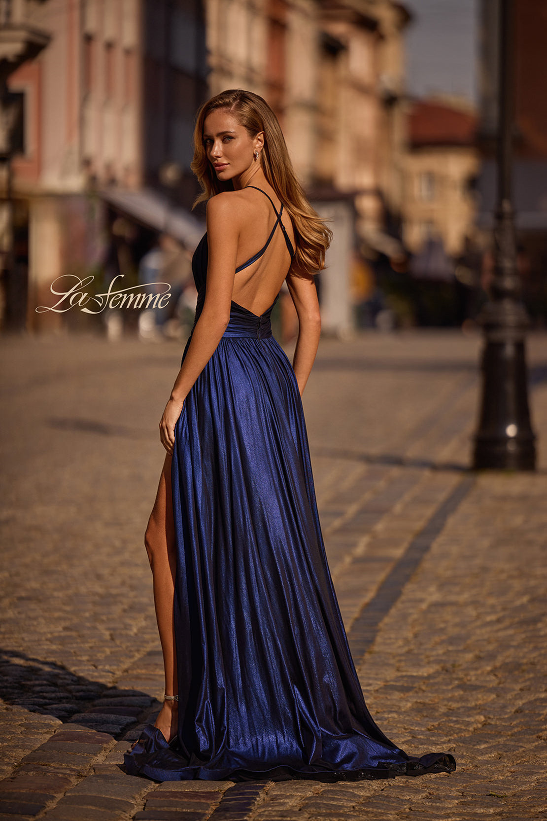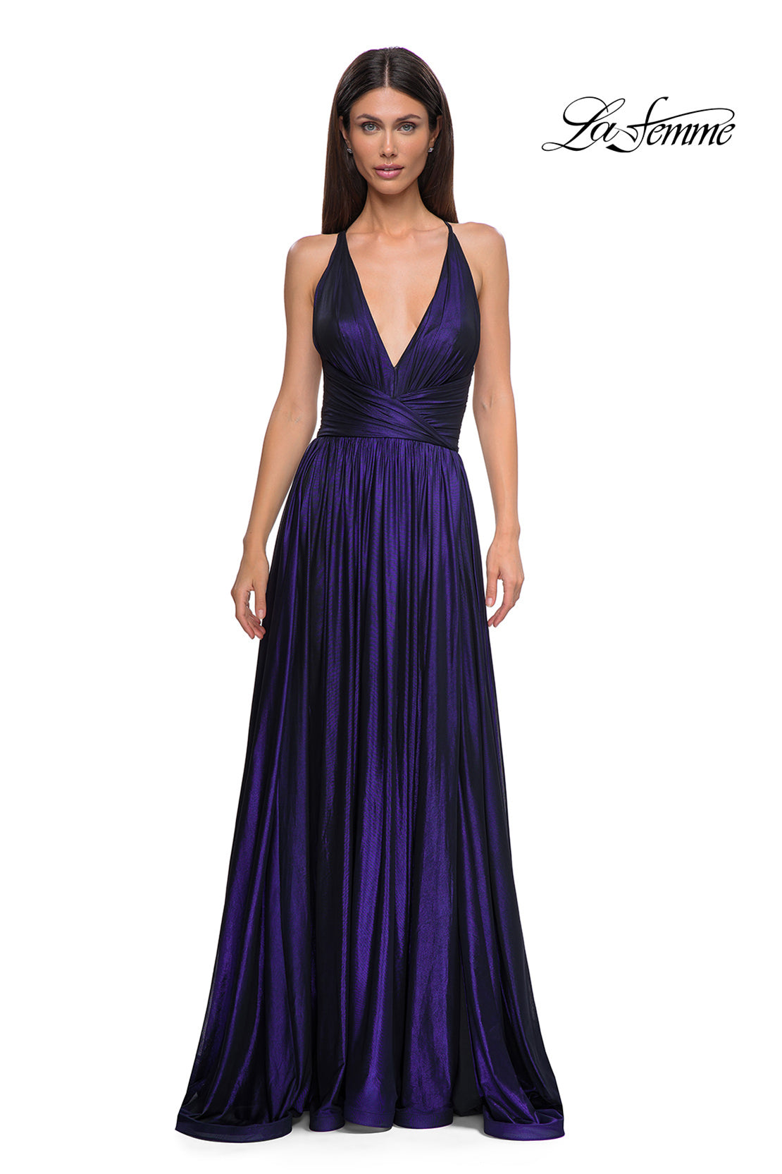 Experience the allure of the La Femme 32917, a stunning creation from the Spring 2025 Evening Collection designed to captivate at every formal occasion. Crafted from shimmering metallic fabric, this sleeveless A-line gown envelops you in radiant elegance, its delicate pleating adding depth and movement that catch the light with every step. The deep V-neckline offers a graceful frame, while the tasteful slit elevates your silhouette with subtle drama. Finished with a discreet back zipper, this long dress promises both comfort and sophistication. When you wear La Femme 32917, you embody timeless glamour, turning every evening into an extraordinary moment.