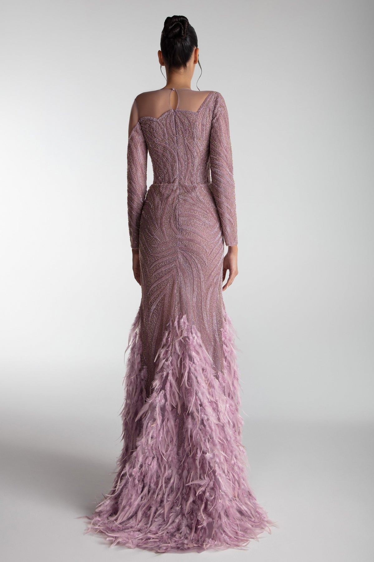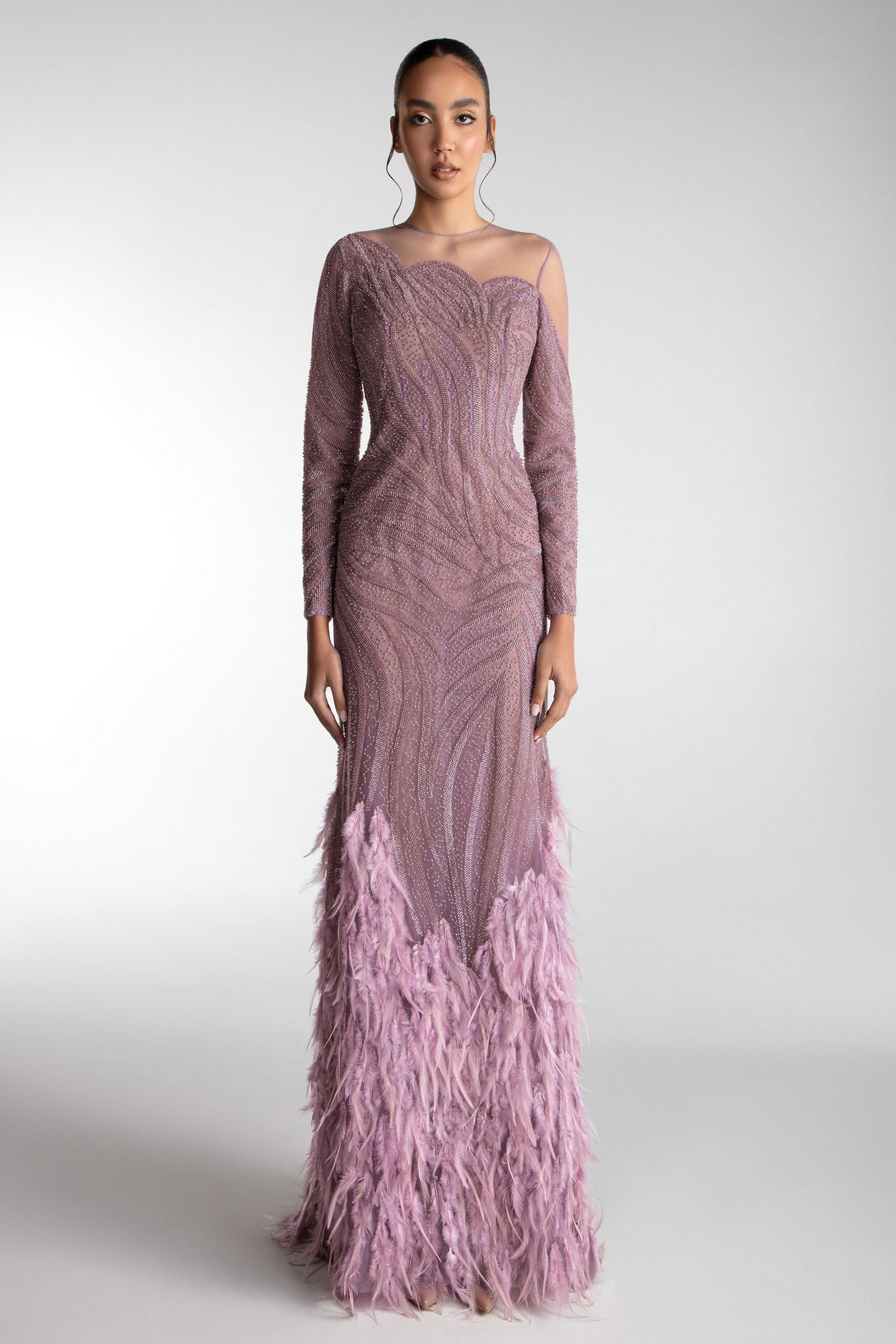 Elevate your evening attire with the Gatti Nolli OP-7713, a stunning creation designed for those who appreciate the finer things in life. This luxurious long dress boasts a fitted silhouette that skillfully accentuates your curves, while the exquisite beaded material glistens under every light, adding an air of sophistication to your presence. The captivating illusion neckline frames your face beautifully, complemented by elegant long sleeves that create a timeless look. Delicate feather details add a whimsical touch, making this dress ideal for special occasions such as couture events or as a standout choice for the mother of the bride. With a convenient zipper back, getting ready becomes a breeze. Experience the perfect blend of glamour and elegance with Gatti Nolli's OP-7713, designed to leave a lasting impression wherever you go.