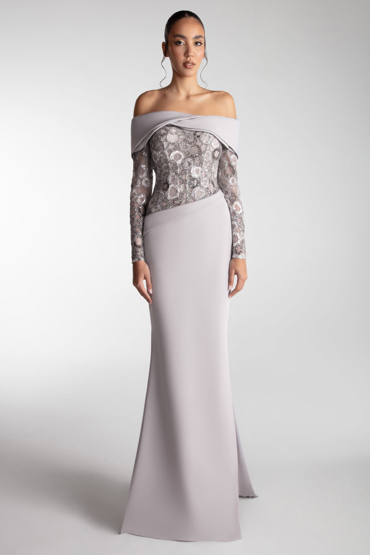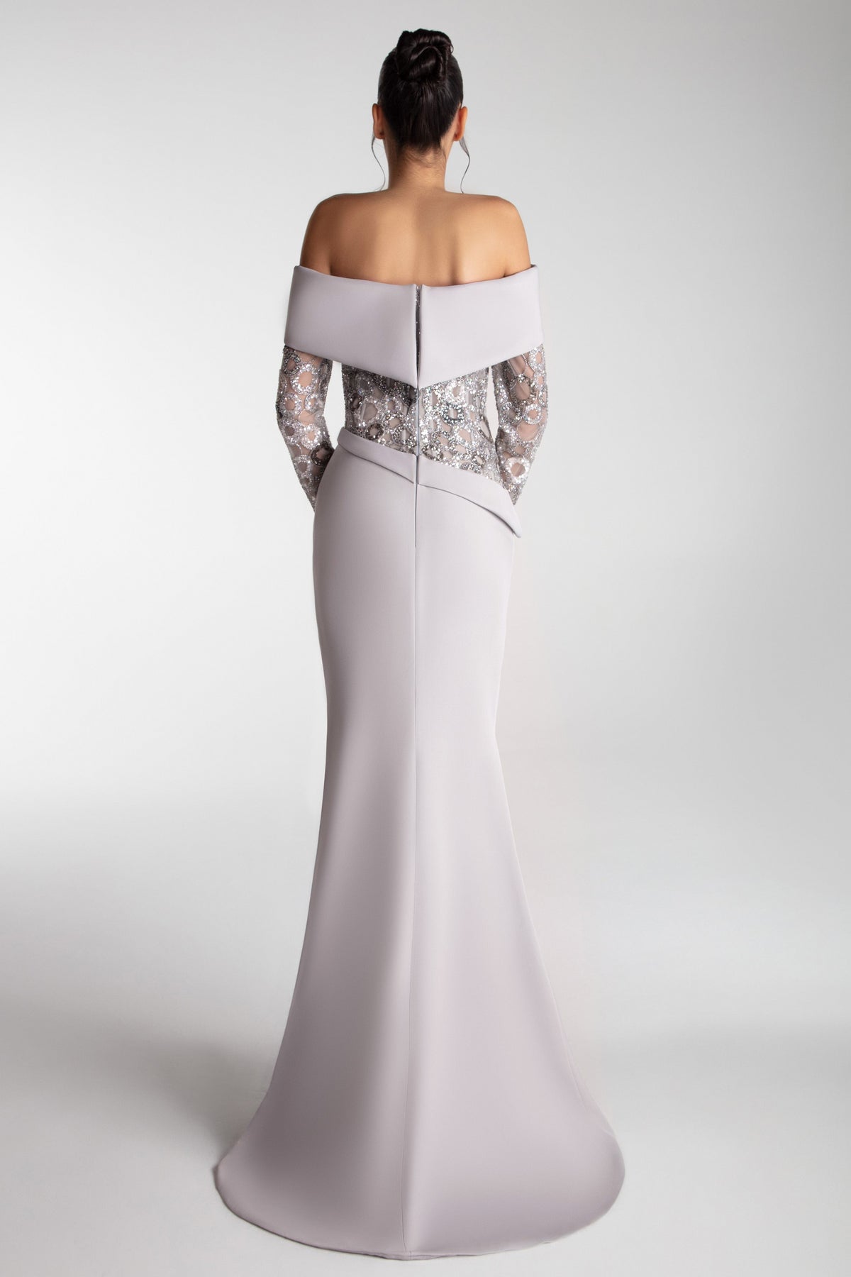 Elevate your evening ensemble with the exquisite Gatti Nolli OP-7717 dress, designed for those unforgettable moments. Crafted from sumptuous crepe, this fitted gown delicately hugs your silhouette, celebrating your elegance. The striking corset detail accentuates your waist, while the strapless neckline and long, off-the-shoulder sleeves add a touch of modern glamour, ensuring you radiate confidence and sophistication. The flowing length of this couture piece is perfect for formal occasions, like a magical evening or a proud Mother of the Bride moment. With a hidden zipper at the back, it offers seamless ease of wear, allowing you to focus on creating beautiful memories. Slip into this stunning dress and let its luxurious fabric and impeccable craftsmanship inspire your every move.