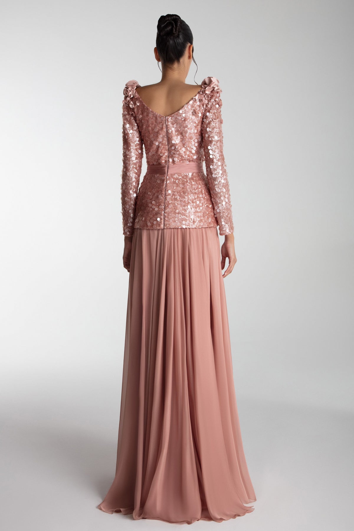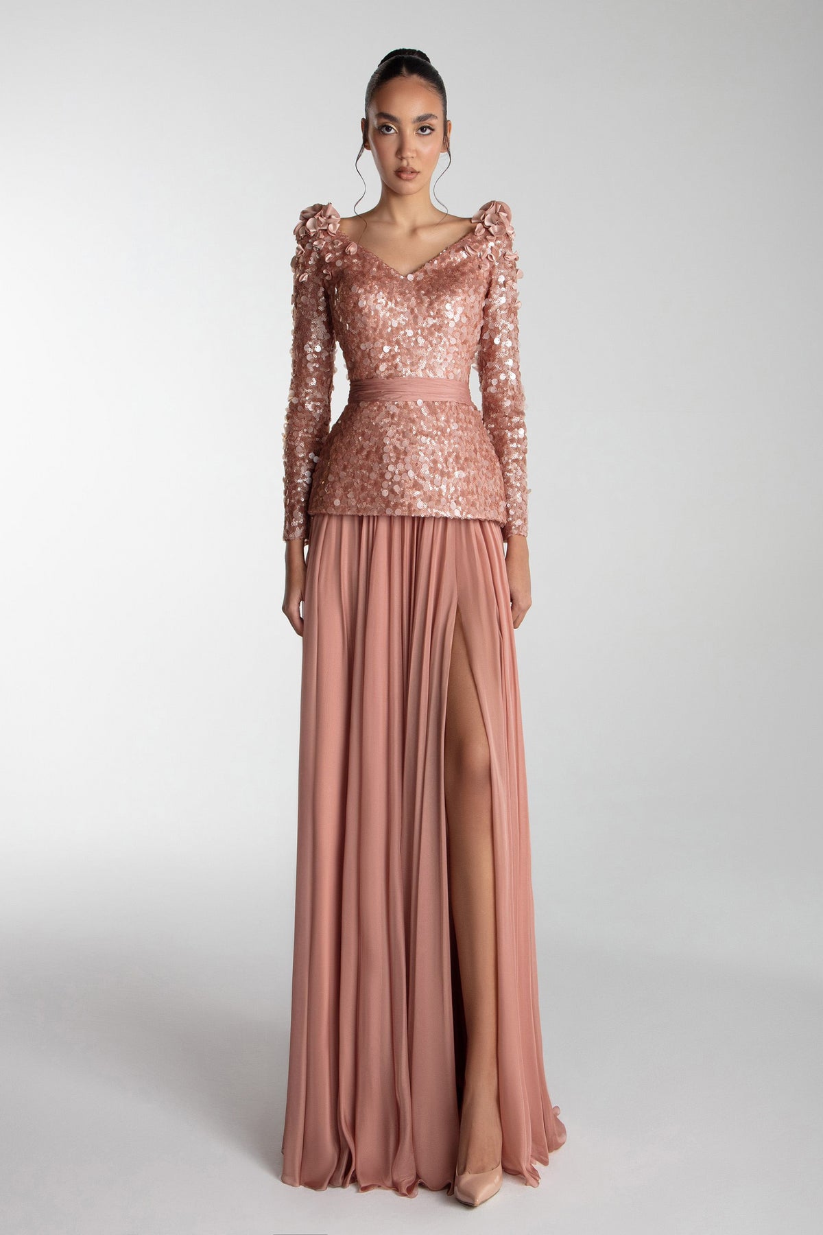 Elevate your evening wardrobe with the Gatti Nolli OP-7720, a stunning masterpiece designed for those memorable occasions. Crafted from luxurious sequin fabric, this fit-and-flare dress glimmers with every step, making you the center of attention. The alluring V-neckline and elegant long sleeves frame your silhouette perfectly, while the expertly placed pleating and sultry slit lend a touch of sophistication and allure. Imagine twirling in this long dress, its movement captivating the eyes of those around you. With a discreet zipper at the back for seamless wear, you’ll experience both beauty and comfort throughout the night. Let the Gatti Nolli OP-7720 become your go-to choice for couture elegance.