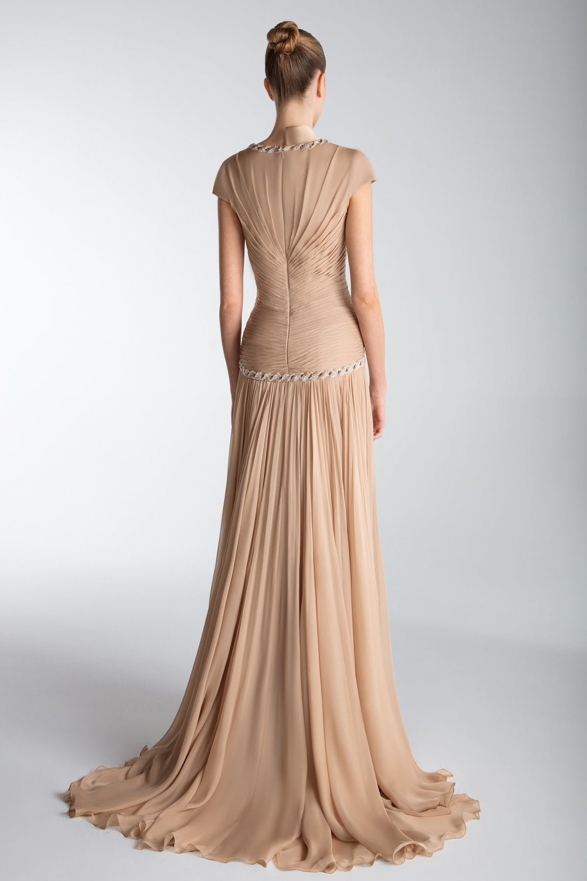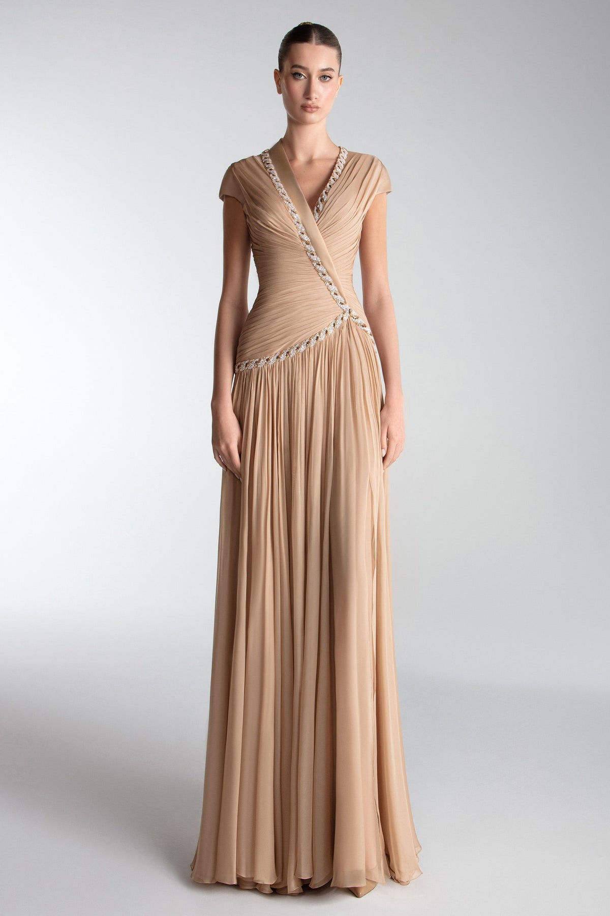Embrace the elegance of the Gatti Nolli OP-7722, a captivating evening dress that embodies luxury and sophistication. Crafted from sumptuous chiffon, this long dress features exquisite pleating that gracefully flares from the fitted bodice, creating a stunning silhouette that flatters your figure. The alluring V-neckline enhances your neckline, while the delicate cap sleeves add a touch of refined femininity. With a subtle slit and a romantic train, this gown is perfect for creating unforgettable moments, whether you’re celebrating as the mother of the bride or attending a couture event. Experience the artistry and craftsmanship of Gatti Nolli, and let this breathtaking piece elevate your formal wardrobe to new heights.