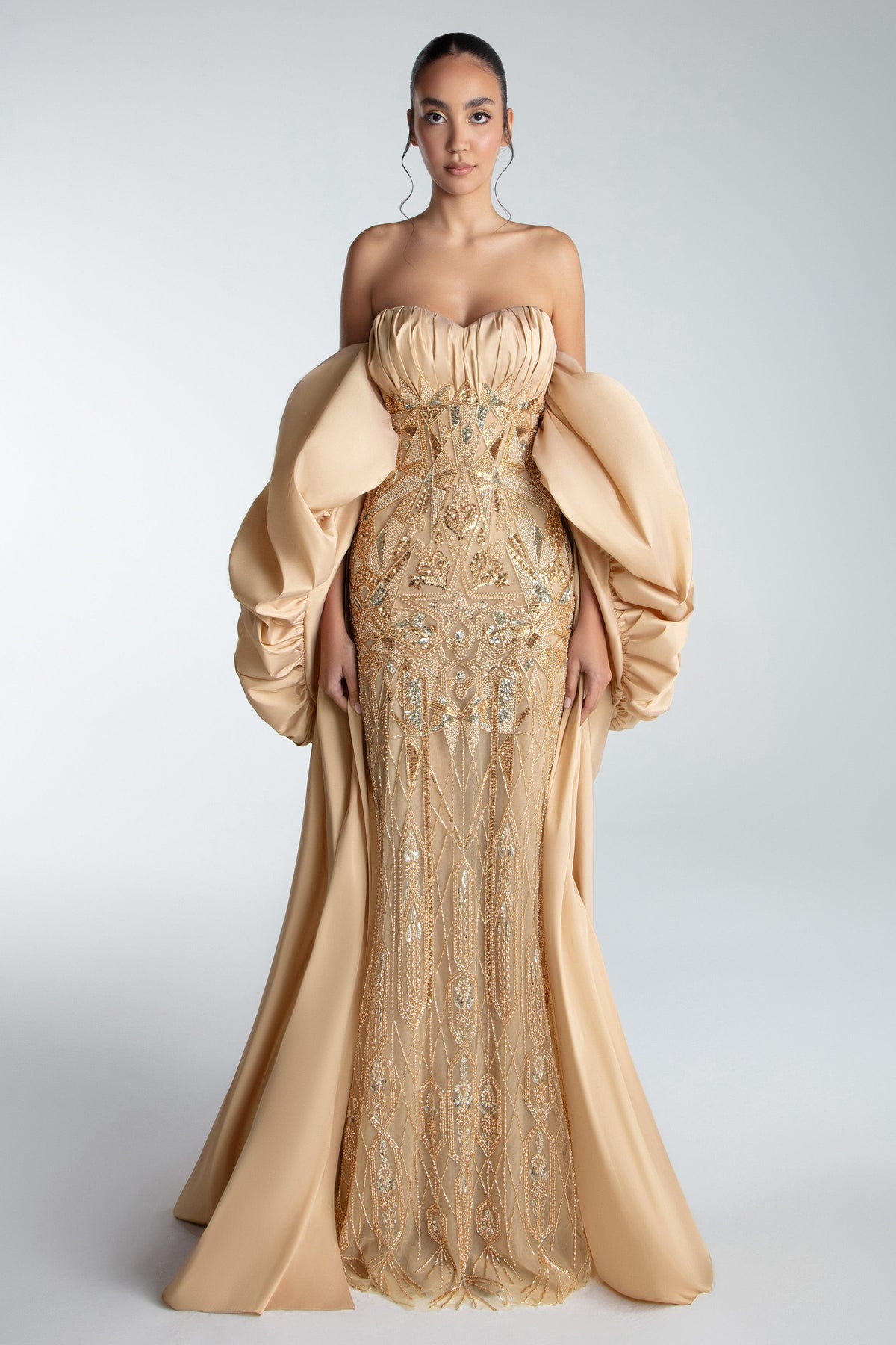 Elevate your evening with the breathtaking Gatti Nolli OP-7723, a couture masterpiece designed for those unforgettable moments. Crafted from exquisite beaded fabric, this fitted gown envelops you in refined opulence, while the enchanting sweetheart neckline and elegant cape sleeves enhance your silhouette with grace. The expertly ruched detailing and dramatic train add a touch of sophisticated drama, ensuring you'll be the center of admiration at any event, especially as a Mother of the Bride. The convenience of a zipper back provides a seamless fit, enabling you to express your unique style effortlessly. Wear this gown and experience a transformative allure that will leave a lasting impression.