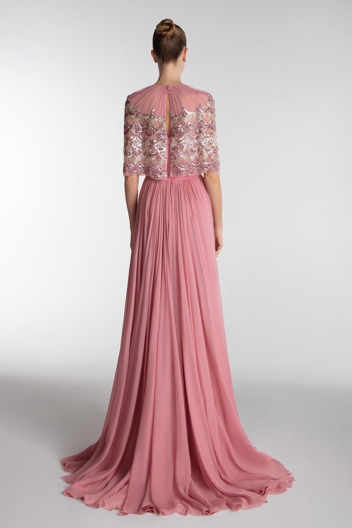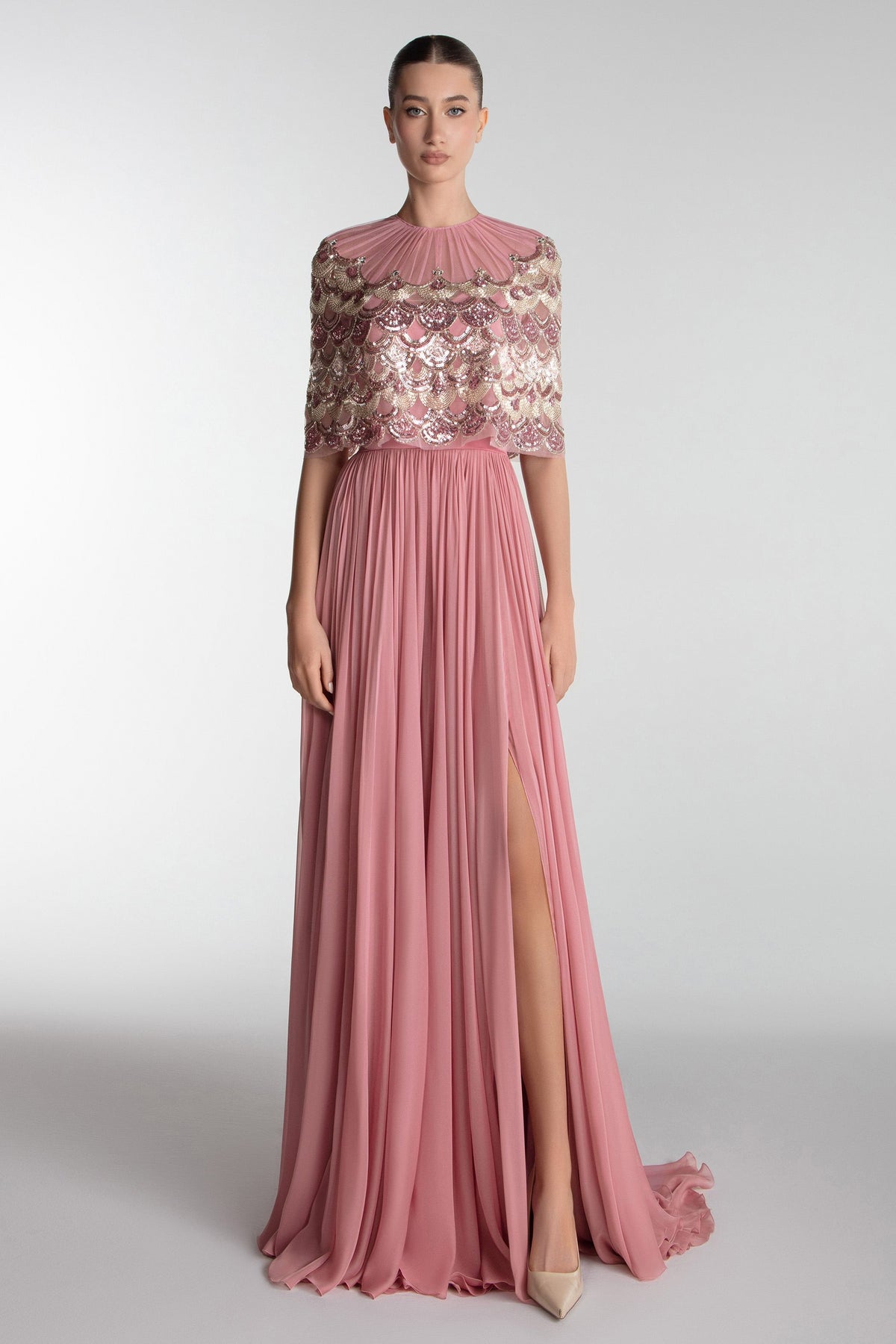 Introducing the Gatti Nolli OP-7724, a stunning A-Line evening dress that epitomizes luxury and elegance. Crafted from exquisite chiffon, this long dress drapes beautifully, allowing you to move with grace and confidence. The meticulous pleating adds a refined texture, while the subtle slit enhances your allure, making it perfect for couture events or as a sophisticated choice for the mother of the bride. Designed with a timeless crew neckline and flattering 3/4 length sleeves, this dress combines classic elements with modern flair. The expertly concealed zipper at the back ensures a seamless fit, allowing you to focus on creating unforgettable memories. Elevate your wardrobe with the Gatti Nolli OP-7724, where sophistication meets effortless style.
