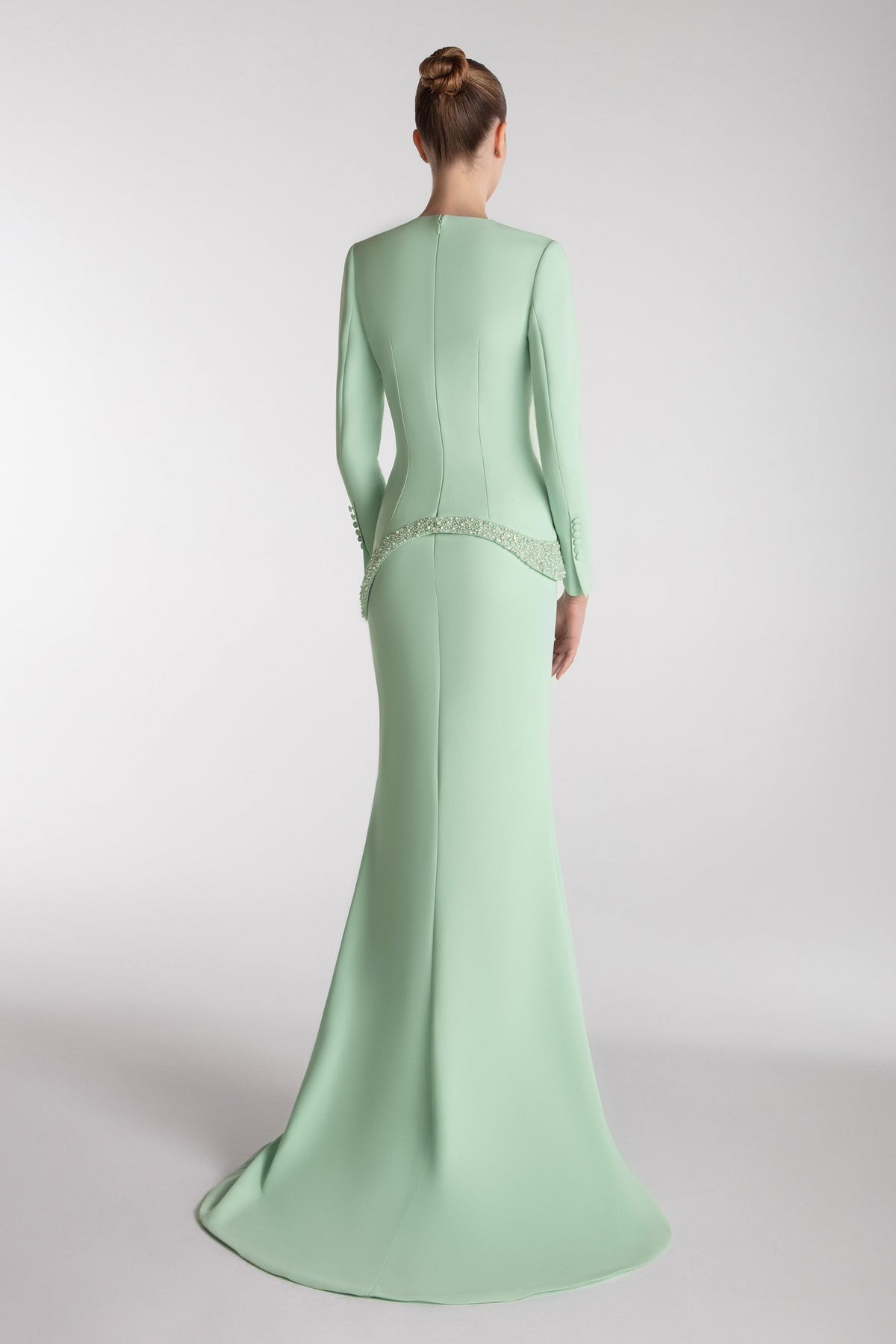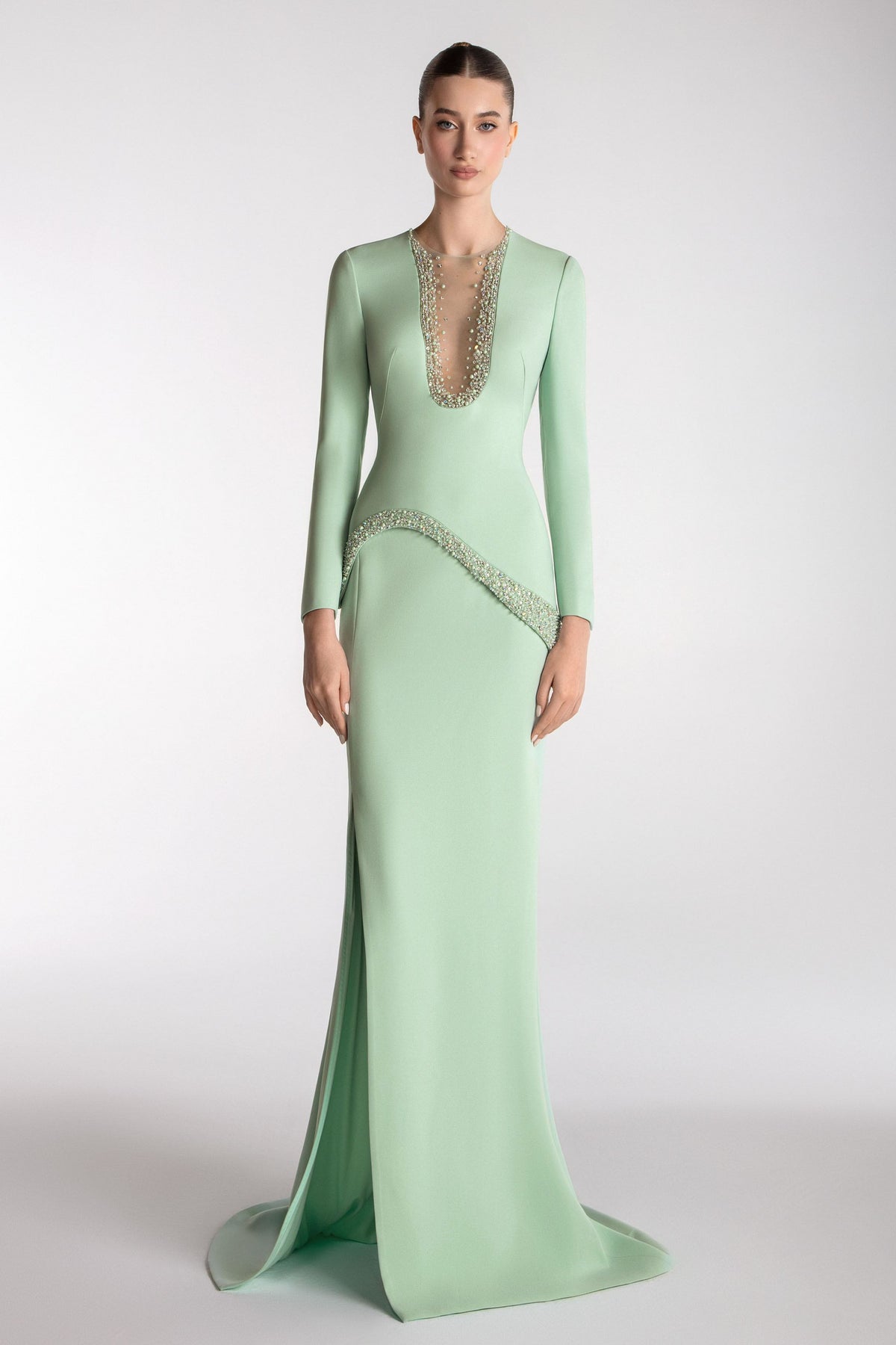 Experience the timeless elegance of the Gatti Nolli OP-7733, a truly exquisite long dress that redefines sophistication for couture events and special occasions. Crafted from luxurious crepe, this fitted masterpiece gently hugs your silhouette, exuding confidence and grace. The high neckline, paired with long sleeves, strikes a perfect balance between modesty and allure, while the daring side slit adds a contemporary twist, empowering you to move effortlessly across the floor. A stunning train flows elegantly behind you, ensuring every step leaves an unforgettable impression. Fastened with a sleek zipper at the back, this dress promises seamless wear and enhances your natural elegance as a mother of the bride or a standout guest. Indulge in the craftsmanship of Gatti Nolli, and let this piece elevate your evening to extraordinary heights.
