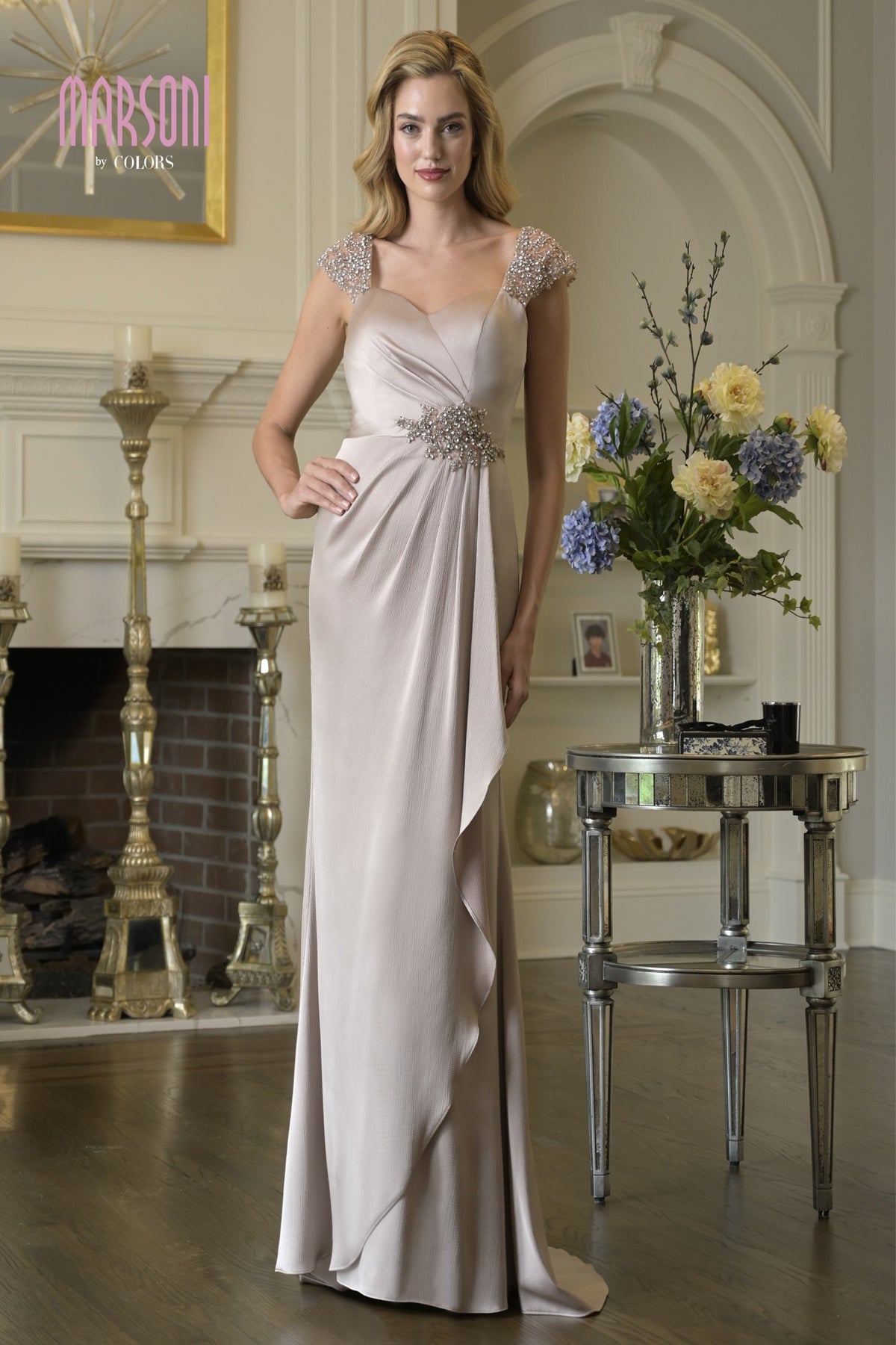 Step into elegance with the Marsoni MV1377 evening dress, a stunning choice for any special occasion, including Mother of the Bride moments. Crafted from luxurious crepe, this fitted gown elegantly drapes over your curves, offering a silhouette that flatters and enhances. The sweetheart neckline beautifully frames your décolletage, while the delicate cap sleeves add a refined touch. With a long length that flows gracefully with each step, this gown envelops you in sophistication, ensuring you shine bright in the spotlight. The discreet zipper back promises ease of wear, making it an effortless addition to your wardrobe for elegant evenings.