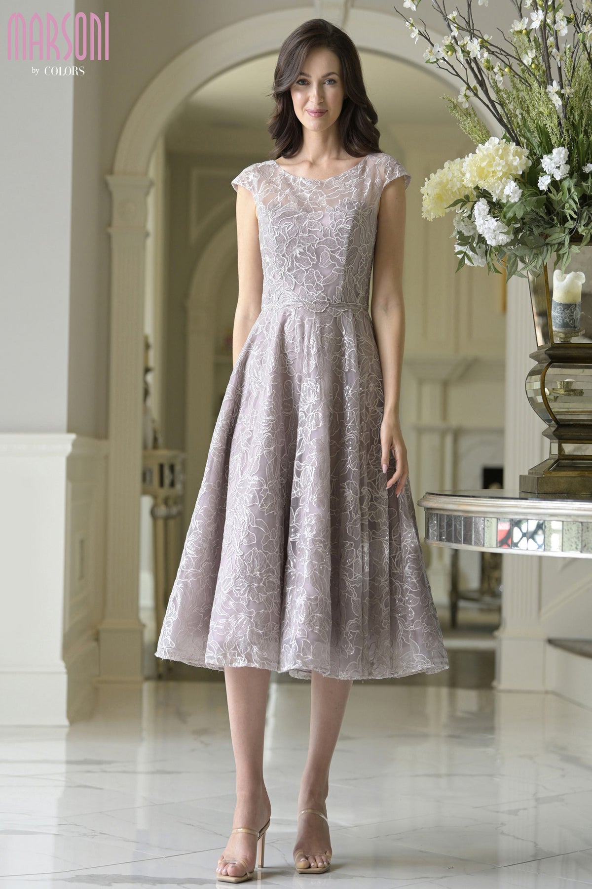 Introducing the Marsoni MV1387, a stunning cocktail dress designed for those who appreciate elegance and comfort. Featuring a captivating lace material, this fit-and-flare silhouette beautifully enhances your feminine shape, while the knee-length design provides sophistication perfect for any festive occasion. The subtle pleating adds movement and grace, creating a romantic aura that will make you feel like the center of attention. With a classic crew neckline and stylish cap sleeves, this piece combines timeless charm with modern appeal. Adjusting to your form with a discreet back zipper, the Marsoni MV1387 ensures a flawless fit that celebrates your curves. Elevate your wardrobe and exude luxury at every gathering with this exquisite dress.