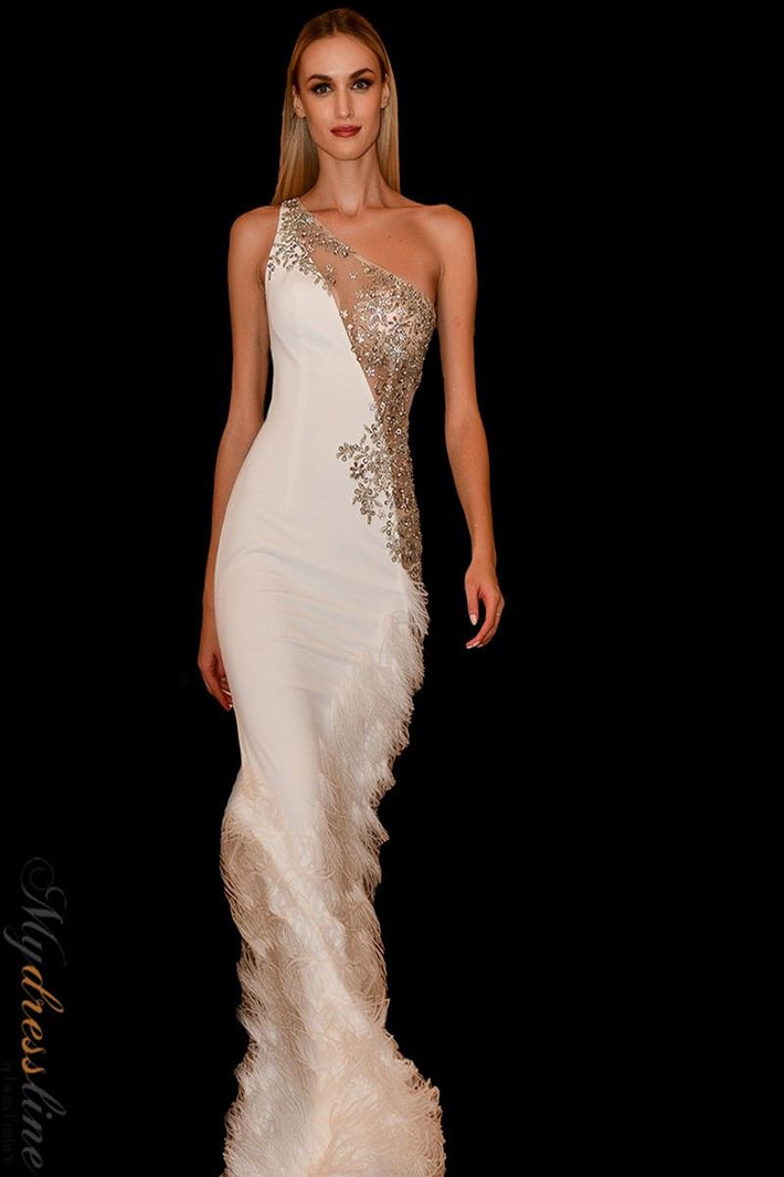 Step into unparalleled elegance with the Jovani 03389, a masterpiece designed for those who command attention. Crafted from smooth crepe and adorned with intricate embroidery, this long, fitted column gown gracefully traces your silhouette, enhancing your natural allure. The striking one-shoulder neckline, accented by delicate feather detailing, adds a refined touch of drama, perfect for making a lasting impression at evening or prom events. With its sleek zipper back, this sleeveless couture piece offers both comfort and sophistication, enveloping you in timeless luxury that transforms every moment into an extraordinary celebration of style.