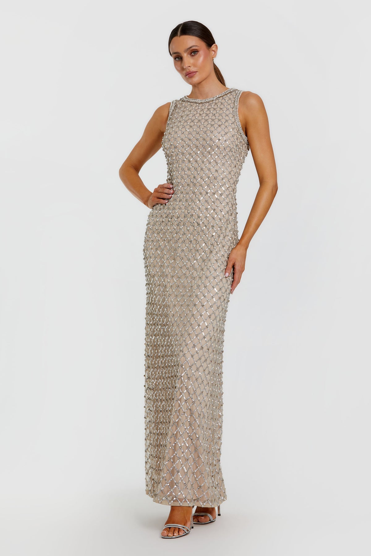 Elevate your evening allure with the Mac Duggal 10129 gown, a stunning embodiment of sophistication and glamour. Crafted from luxurious sequin and mesh, this floor-length masterpiece envelops the figure in a fluid column silhouette, accentuated by intricate beading and dazzling crystals that catch the light with every graceful movement. The sleeveless design and scoop neckline create an elegant frame, while the discreet zipper back ensures a flawless fit. Perfect for galas, formal events, or prom nights, this gown promises to make a statement, turning every entrance into a moment of enchantment.